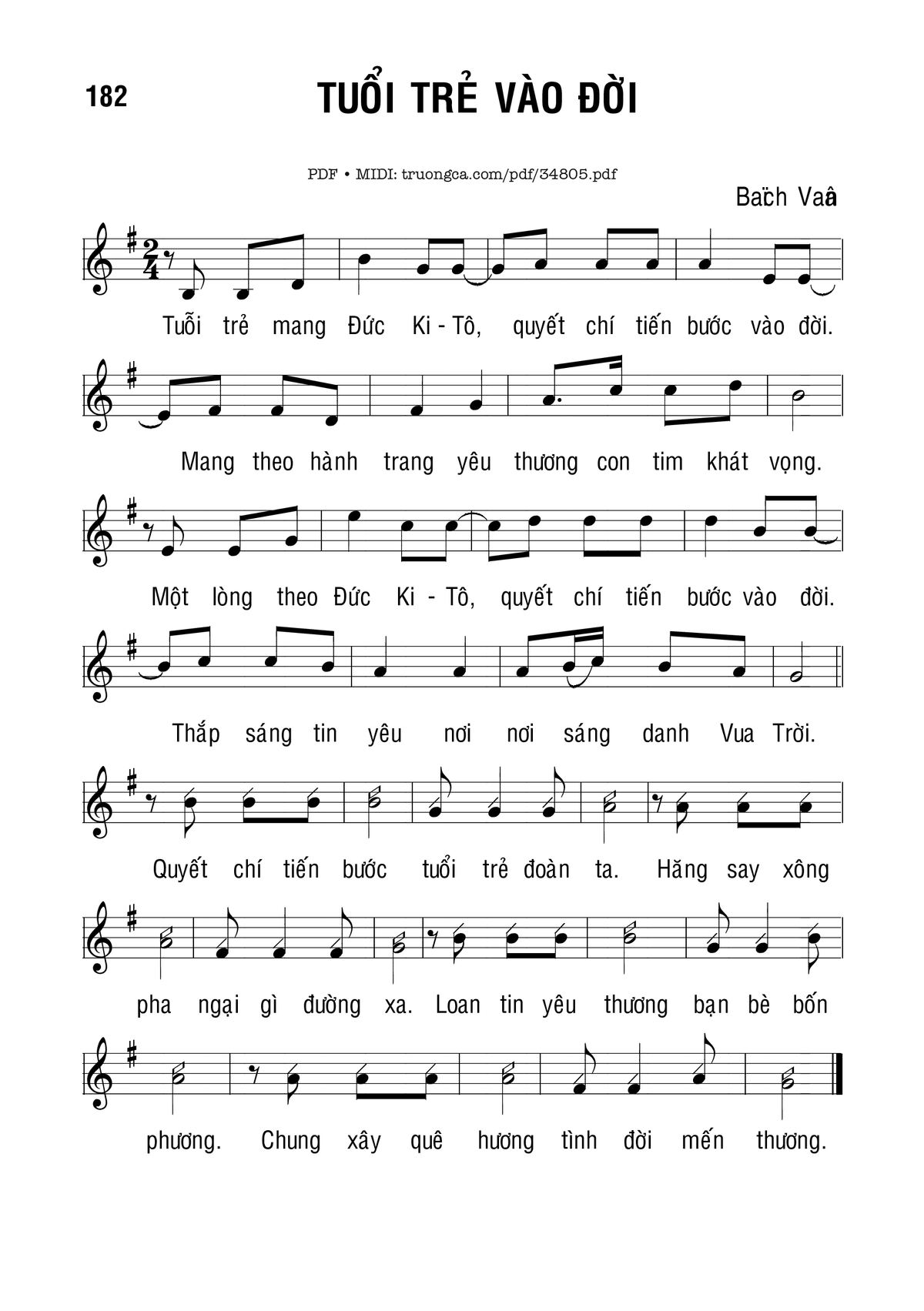 Tuổi trẻ mang Đức Ki-tô, quyết chí tiến bước vào đời. Mang theo hành trang yêu thương con tim khát vọng. Một lòng theo Đức Ki-tô, quyết chí tiến bước vào đời. Thắp sáng tin yêu nơi nơi sáng danh Vua Trời. Quyết chí tiến bước tuổi trẻ đoàn ta. Hăng say xông pha ngại gì đường xa. Loan tin yêu thương bạn bè bốn phương. Chung xây quê hương tình đời mến thương.