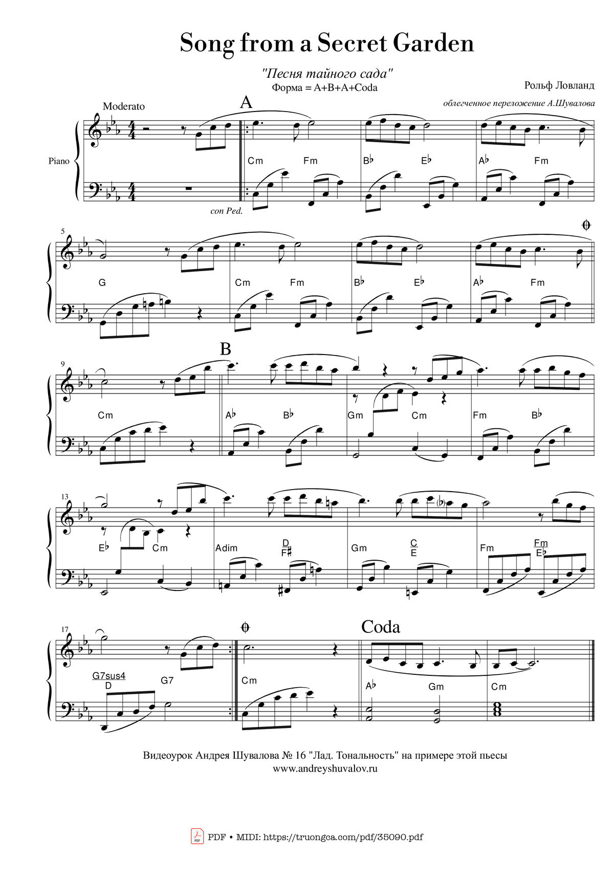 Sheet Piano bản nhạc Song from a Secret Garden Piano EASY (Rolf Lovland) và file PDF đăng lên đây nhằm giúp các bạn tập đàn Piano. Sheet có nốt và hợp âm sưu tập, chỉ mang tính chất tham khảo, không dùng cho mục đích thương mại. Bản quyền thuộc về tác giả và tổ chức nắm bản quyền. Truongca.com không giữ bất kỳ bản quyền của nội dung nào cả. Các bạn có thể tải về bản PDF chất lượng cao bao gồm khuông nhạc với đường link PDF bên trên.