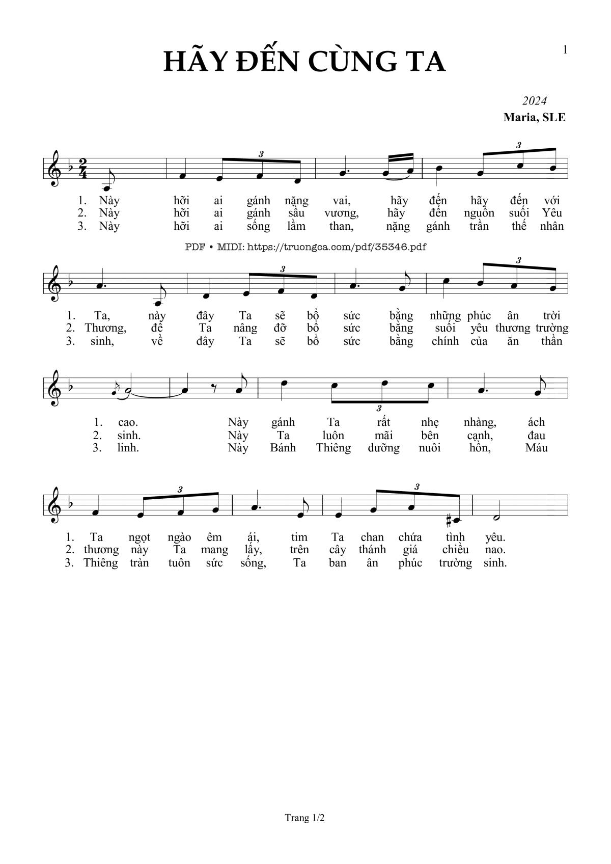 1. Này hỡi ai gánh nặng vai, hãy đến hãy đến với Ta, này đây Ta sẽ bổ sức bằng những phúc ân trời cao. Này gánh Ta rất nhẹ nhàng, ách Ta ngọt ngào êm ái, tim Ta chan chứa tình yêu.