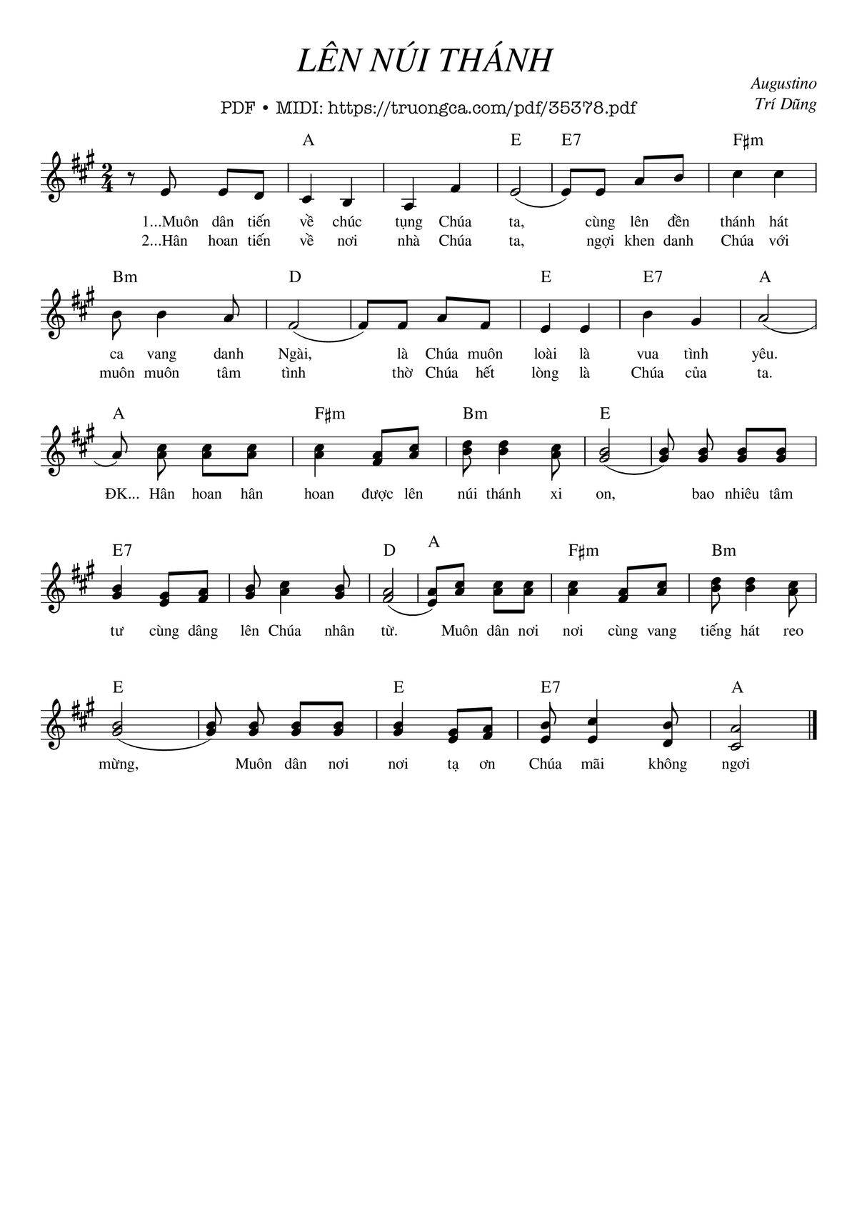 Câu đầu: Muôn dân tiến về chúc tụng Chúa ta cùng lên đền thánh hát ca vang danh Ngài