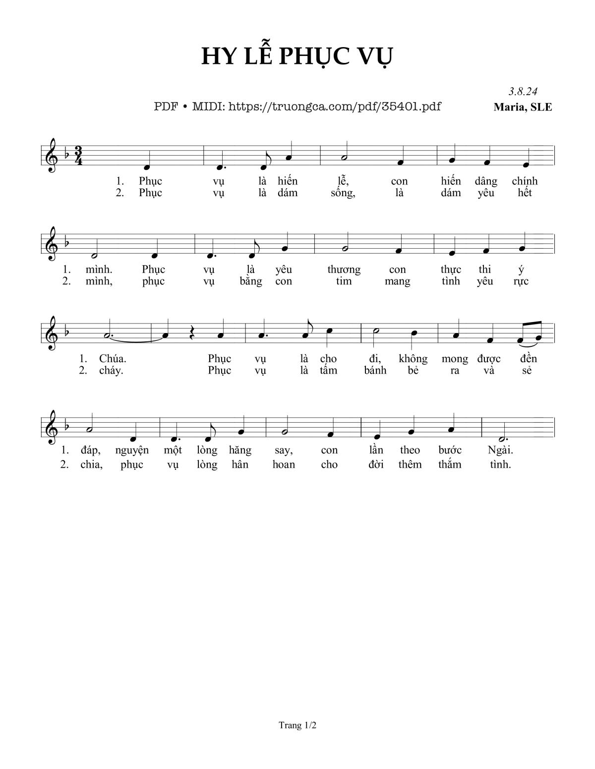 1. Phục vụ là hiến lễ, con hiến dâng chính mình. Phục vụ là yêu thương, con thực thi ý Chúa. Phục vụ là cho đi, không mong được đền đáp, nguyện một lòng hăng say, con lần theo bước Ngài.