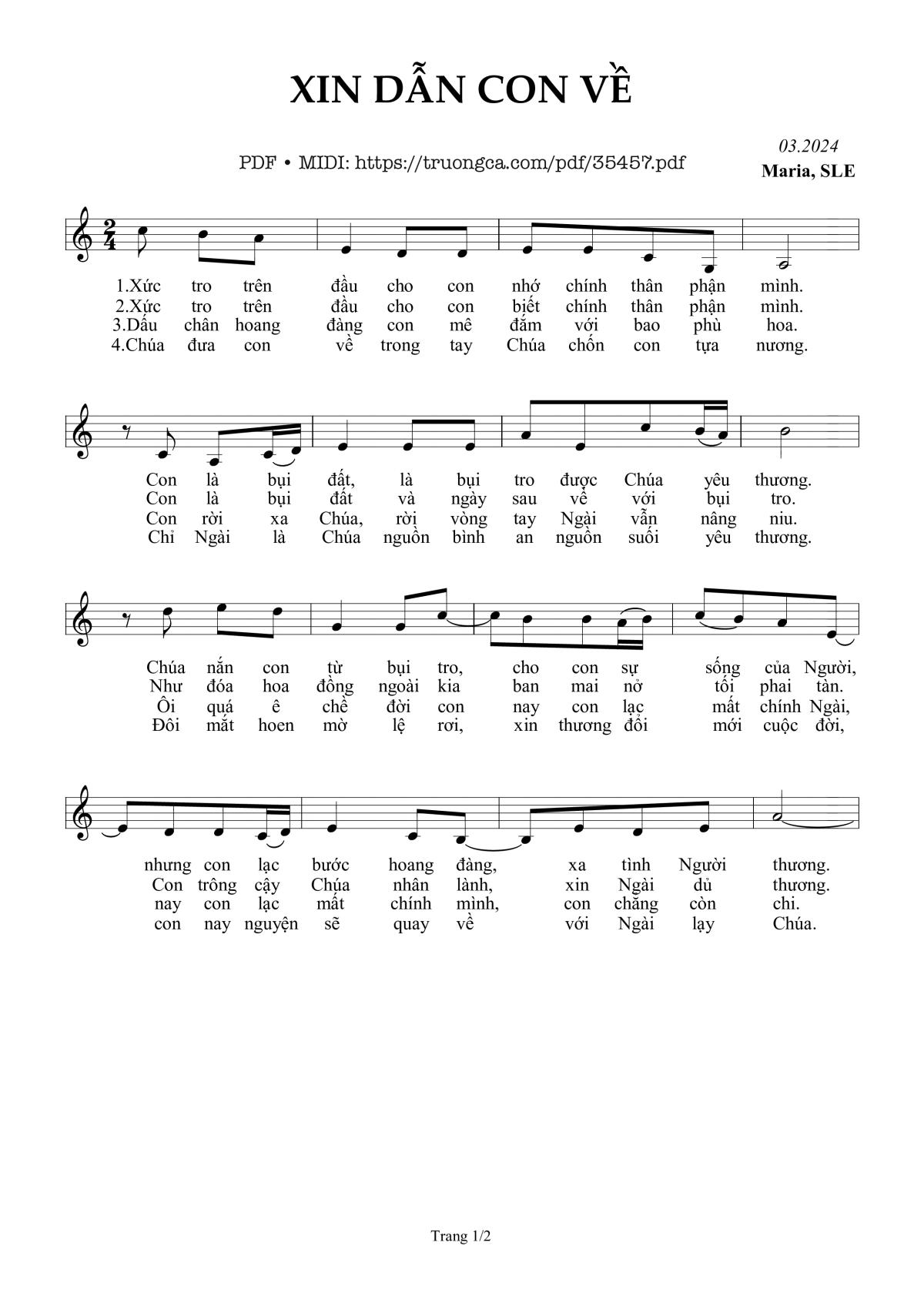 Điệp khúc. Chúa ơi! Xin dẫn con về, xin dẫn con về bên lòng Chúa từ nhân. Ôm con vào trong lòng Ngài, cho con cảm mến ân tình lâu nay con đã làm mất. Xin thương tha thứ khoan hồng, xin thương tẩy xóa lỗi lầm, cho con trở nên trong sạch để xứng đáng tình Ngài yêu.