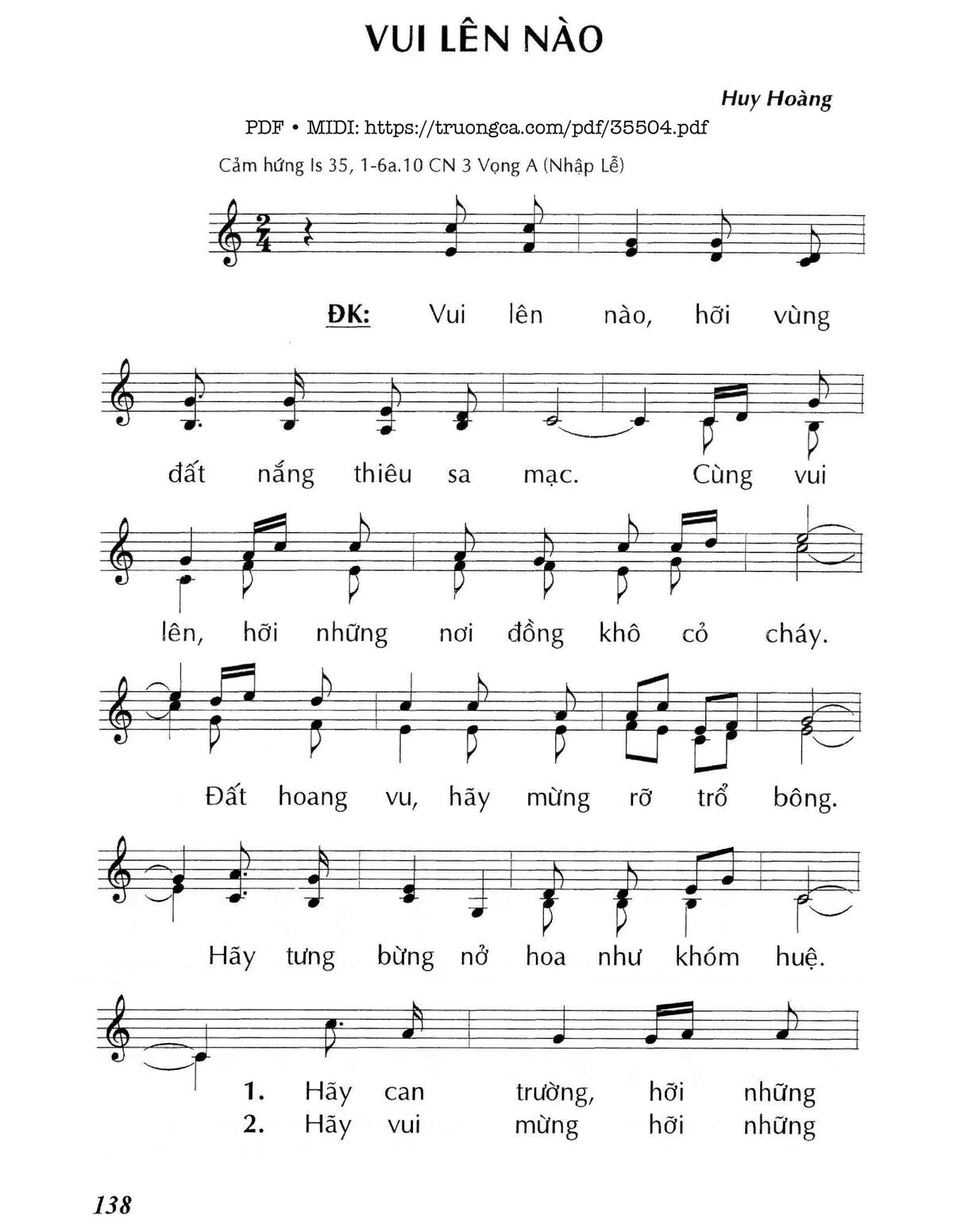 Điệp khúc: Vui lên nào, hỡi vùng đất nắng thiêu sa mạc. Cùng vui lên, hỡi những nơi đồng khô cỏ cháy. Đất hoang vu, hãy mừng rỡ trổ bông. Hãy tưng bừng nở hoa như khóm huệ.
