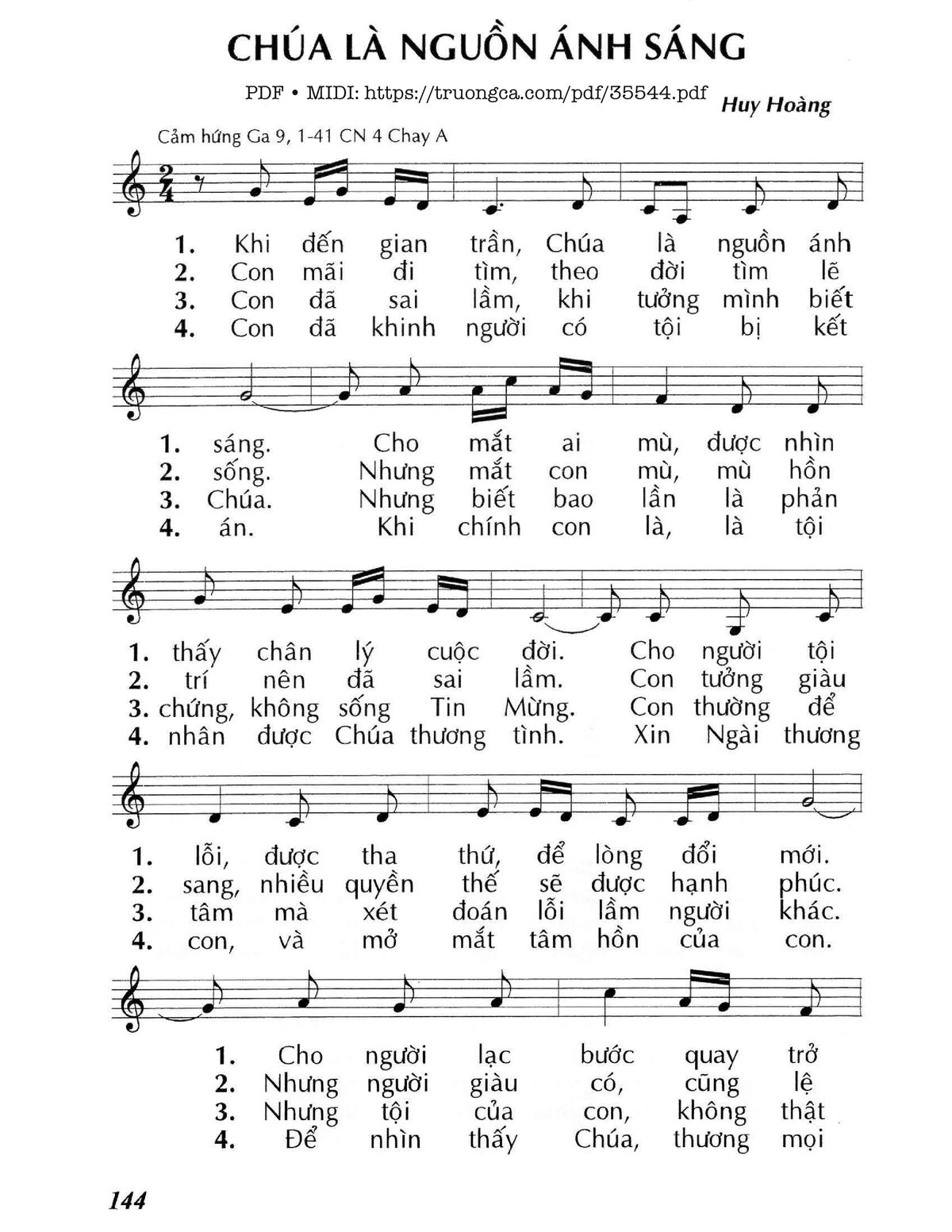 Điệp khúc: Con tin Chúa là là nguồn ánh sáng cho đời. Mắt con mù lòa, biết bao lần chẳng nhìn thấy Chúa. Xin hãy mở tâm, mở trí và mở mắt này, để nhìn thấy Chúa, để hưởng niềm vui ơn phúc cứu độ.