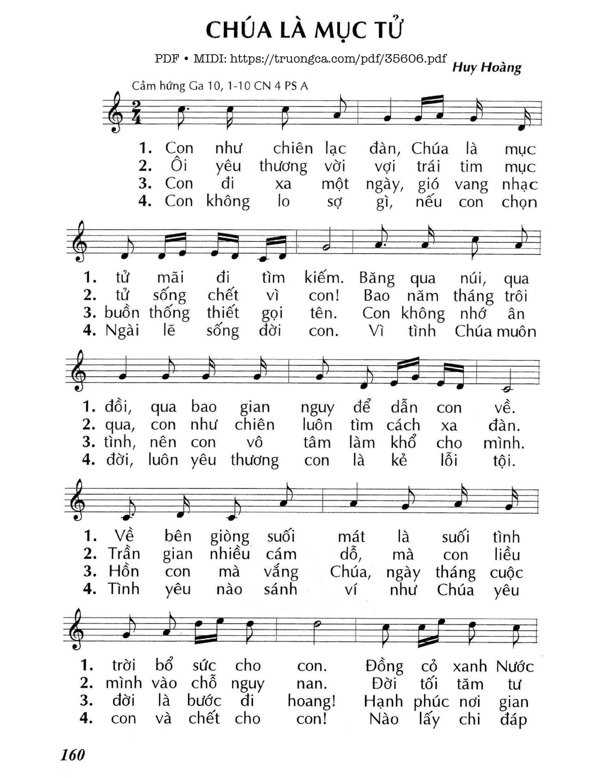 Điệp khúc: Chúa là mục tử suốt đời chịu khổ vì con. Con bao lần lạc bước, Chúa đi tìm đưa về nẻo ngay. Con dại khờ lỗi tội, gây cho mình nhiều vết thương đau. Chúa đã chữa cho lành, vì vui chịu chết trên thập hình!