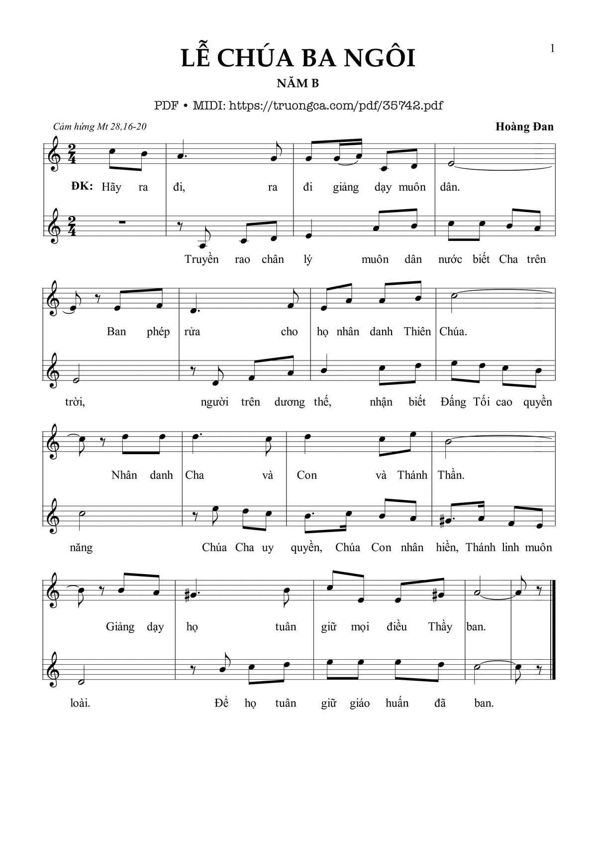 Điệp khúc: Hãy ra đi, ra đi giảng dạy muôn dân. Ban phép rửa cho họ nhân Danh Thiên Chúa. Nhân Danh Cha và Con và Thánh Thần. Giảng dạy họ tuân giữ mọi điều Thầy ban.
