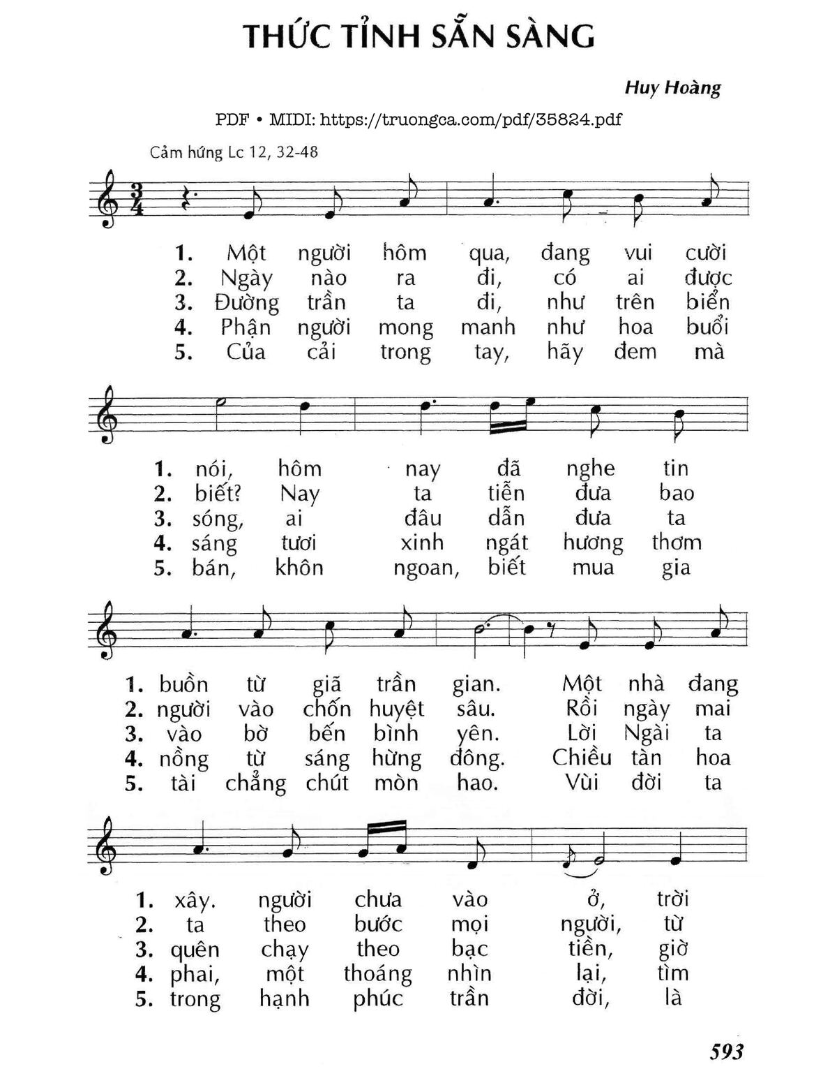Điệp khúc: Người ơi hãy thức, thức tỉnh sẵn sàng như người tôi hiền đợi chủ về giữa đêm khuya. Thắt lưng cho gọn, cầm đèn cháy sáng đón chờ, để khi chủ về thấy còn tỉnh thức, cửa mở sẵn sàng.