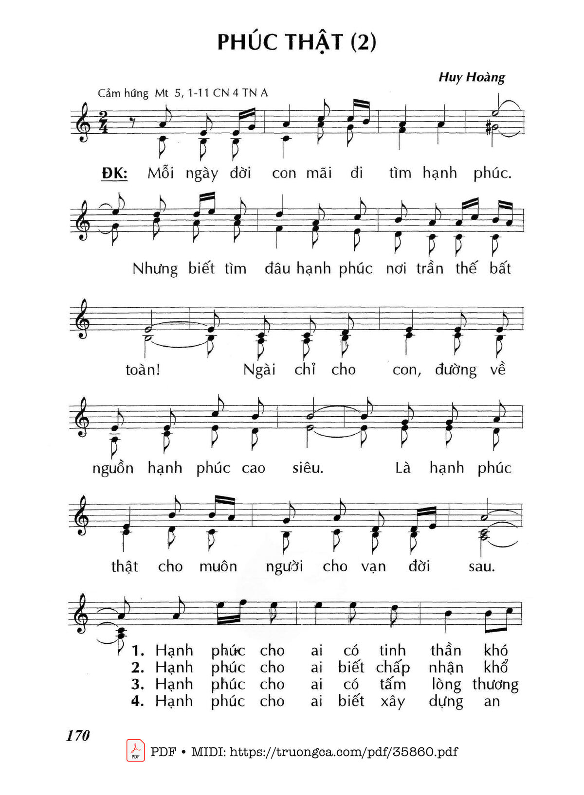 Điệp khúc: Mỗi ngày đời con mãi đi tìm hạnh phúc. Nhưng biết tìm đâu hạnh phúc nơi trần thế bất toàn. Ngài chỉ cho con, đường về nguồn hạnh phúc cao siêu. Là hạnh phúc thật cho muôn người cho vạn đời sau.