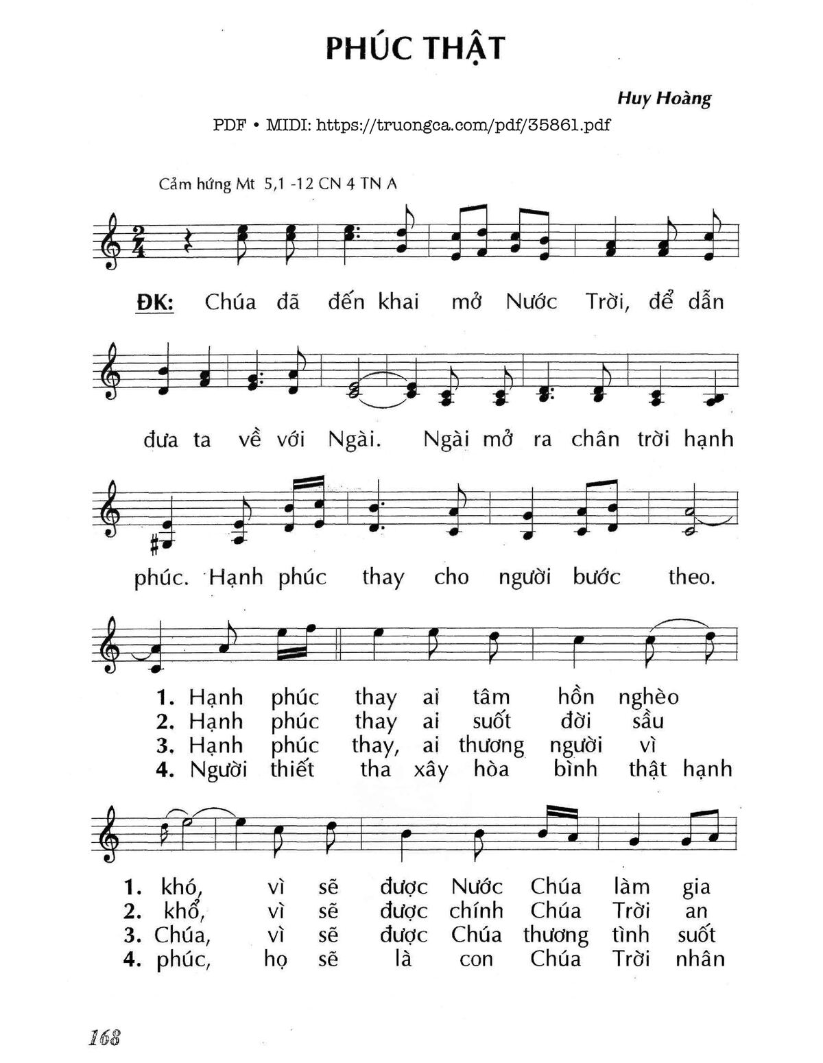 1. Hạnh phúc thay ai tâm hồn nghèo khó, vì sẽ được Nước Chúa làm gia nghiệp. Hạnh phúc thay ai hiền lành từ ái, vì sẽ được Đất Hứa làm quê hương.