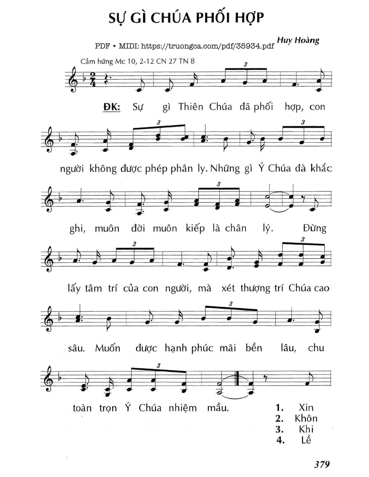 Điệp khúc: Sự gì Thiên Chúa đã phối hợp, con người không được phép phân ly. Những gì Ý Chúa đà khắc ghi, muôn đời muôn kiếp là chân lý. Đừng lấy tâm trí của con người, mà xét thượng trí Chúa cao sâu. Muốn được hạnh phúc mãi bền lâu, chu toàn trọn Ý Chúa nhiệm mầu.