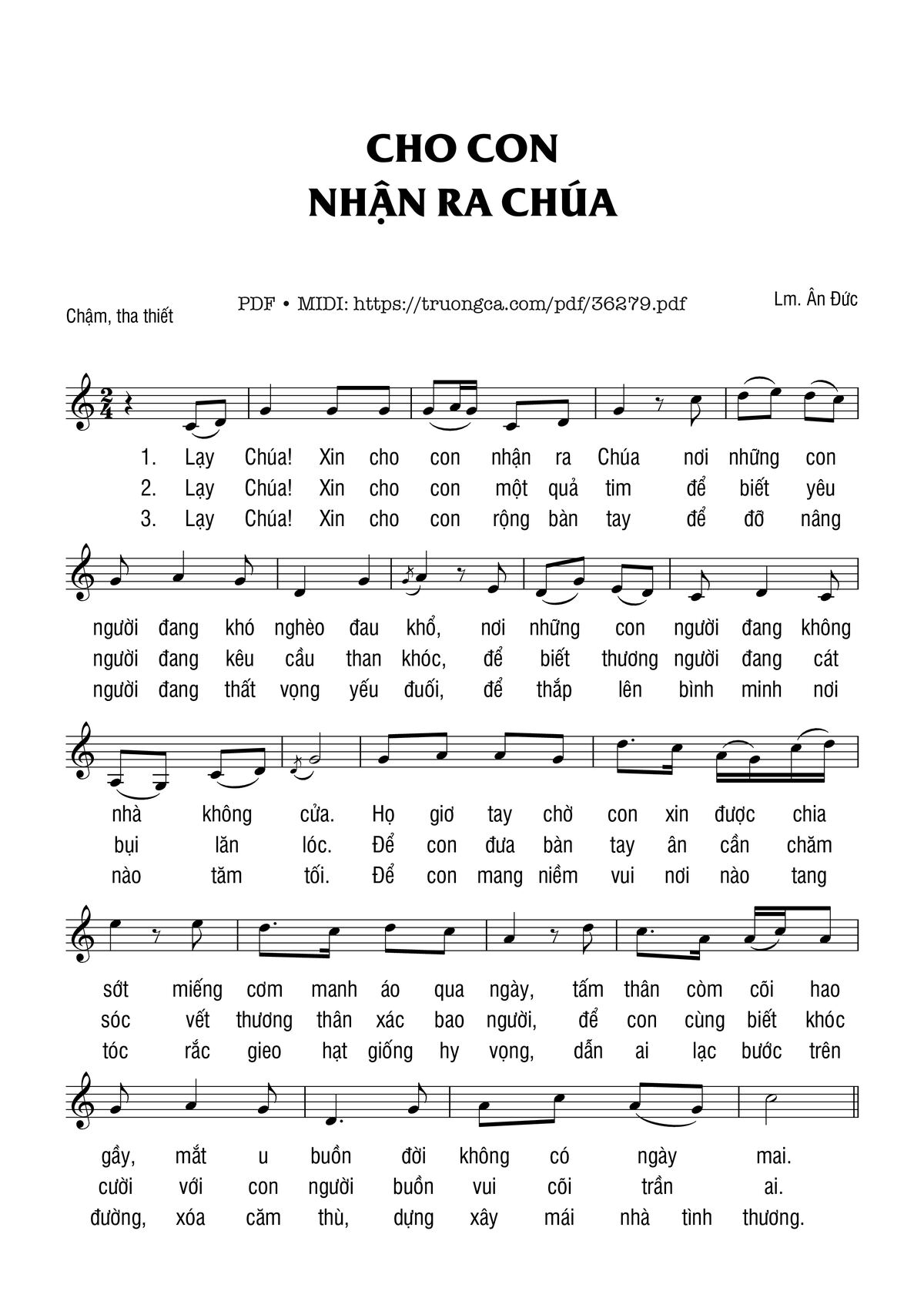 Phần nghe hát Cho Con Nhận Ra Chúa (Ân Đức) được nhúng từ Youtube, Musescore hoặc link ngoài và chịu sự kiểm soát bản quyền của bên thứ ba đó, vì vậy có thể bị xóa hoặc chèn quảng cáo bất kỳ lúc nào. Nếu bạn không nghe - xem được ca sĩ hát tức là đã bị Youtube hoặc Musescore kiểm soát.