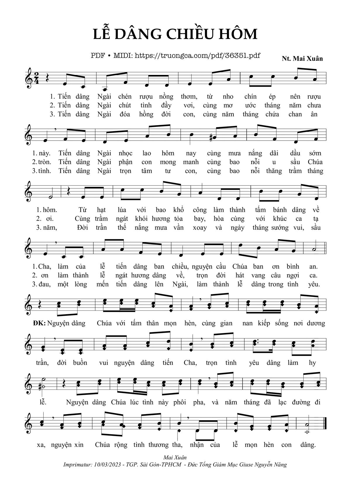Phần nghe hát Lễ Dâng Chiều Hôm (Mai Xuân) được nhúng từ Youtube, Musescore hoặc link ngoài và chịu sự kiểm soát bản quyền của bên thứ ba đó, vì vậy có thể bị xóa hoặc chèn quảng cáo bất kỳ lúc nào. Nếu bạn không nghe - xem được ca sĩ hát tức là đã bị Youtube hoặc Musescore kiểm soát.
