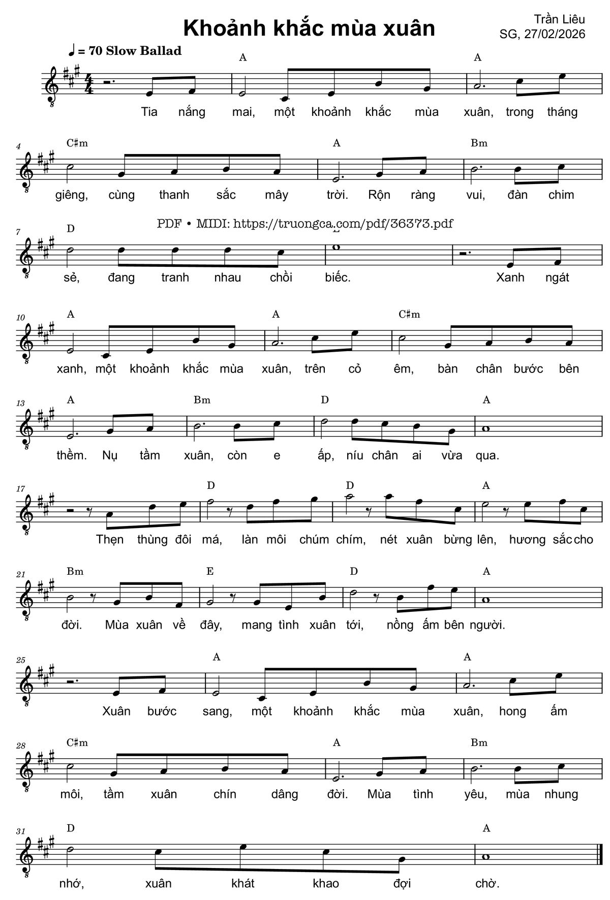 Chọn nút dấu + để tăng tông lên nửa cung, nút dấu - để giảm tông xuống nửa cung. Rê chuột vào hợp âm để xem các thế bấm hợp âm của bài hát Khoảnh khắc mùa xuân.