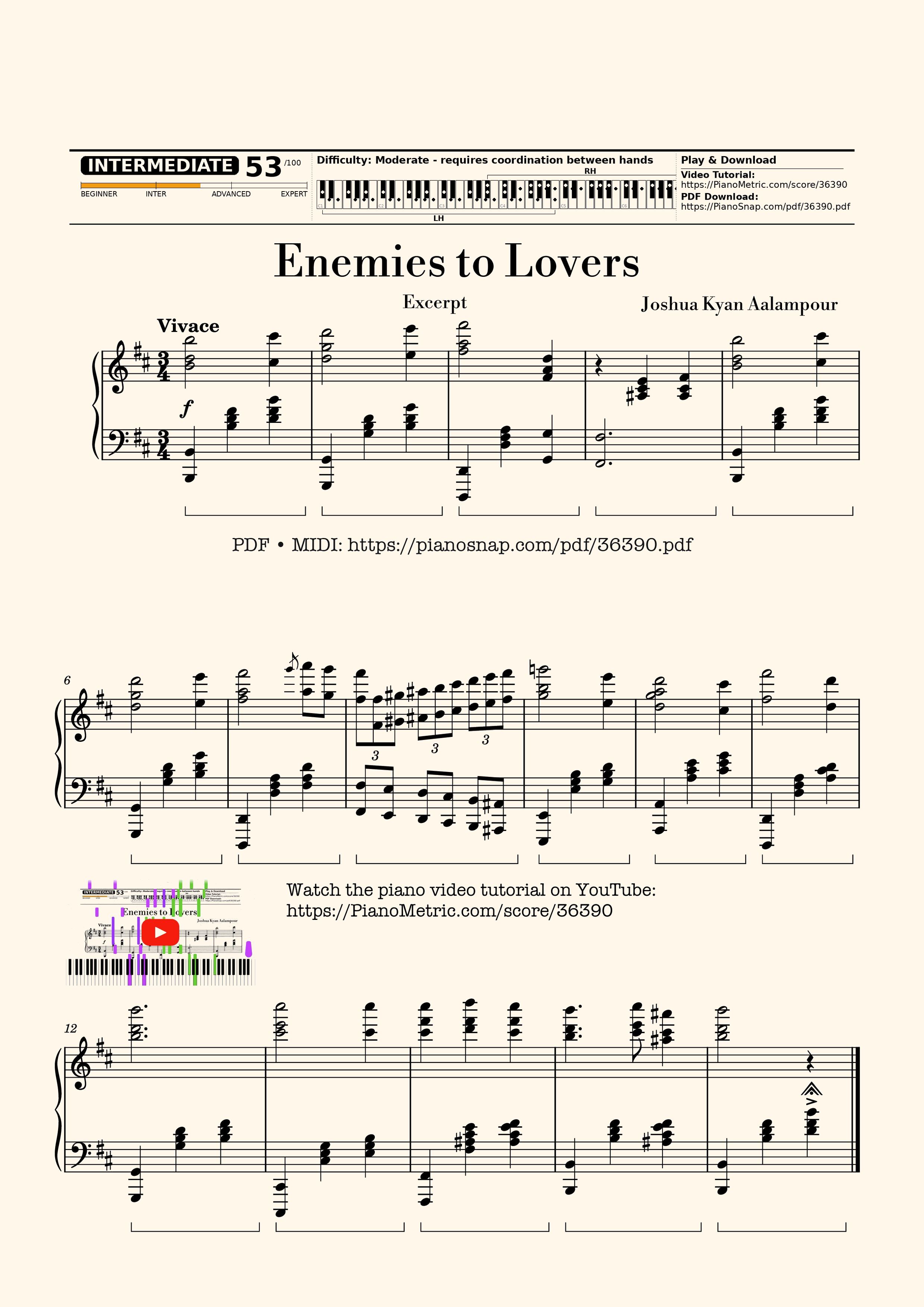 Phần đàn mẫu Enemies to Lovers Excerpt Piano (Joshua Kyan Aalampour) được nhúng từ Youtube, Musescore hoặc link ngoài và chịu sự kiểm soát bản quyền của bên thứ ba đó, vì vậy có thể bị xóa hoặc chèn quảng cáo bất kỳ lúc nào. Nếu bạn không nghe - xem được phần đàn mẫu hát mẫu tức là đã bị Youtube/Musescore kiểm soát.