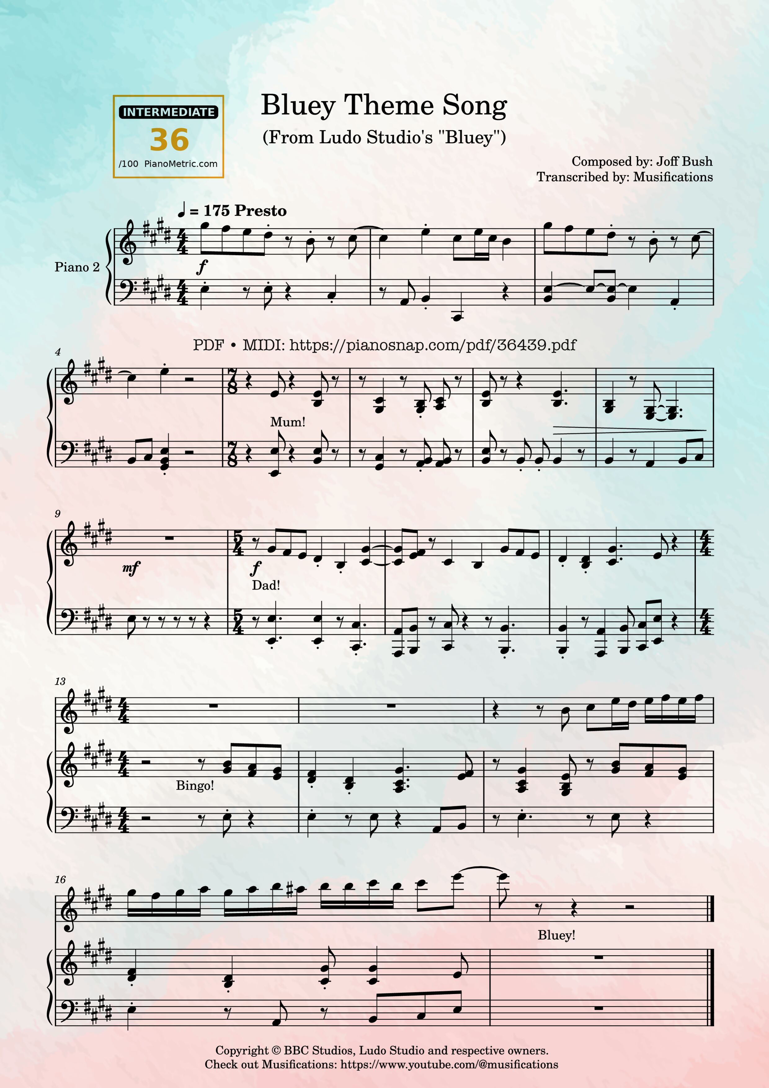 Download and print in PDF or MIDI free sheet music of Bluey Theme Song (From Ludo Studios' Bluey) - Joff Bush for Bluey Theme Song (From Ludo Studios' Bluey) by Joff Bush arranged by Musifications for Piano (Solo)