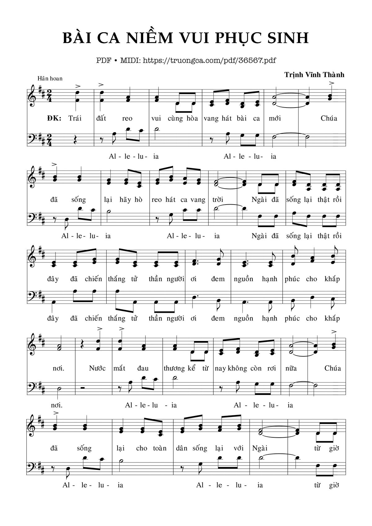 Điệp khúc. Trái đất reo vui cùng hòa vang hát bài ca mới. Chúa đã sống lại, hãy hò reo hát ca vang trời. Ngài đã sống lại thật rồi, đây đã chiến thắng tử thần người ơi, đem nguồn hạnh phúc cho khắp nơi. Nước mắt đau thương kể từ nay không còn rơi nữa. Chúa đã sống lại cho toàn dân sống lại với Ngài. Từ giờ này cho đến mai sau tôi sẽ không còn phải chết nữa, ai tin theo Ngài âu sầu biến thành hoan ca.