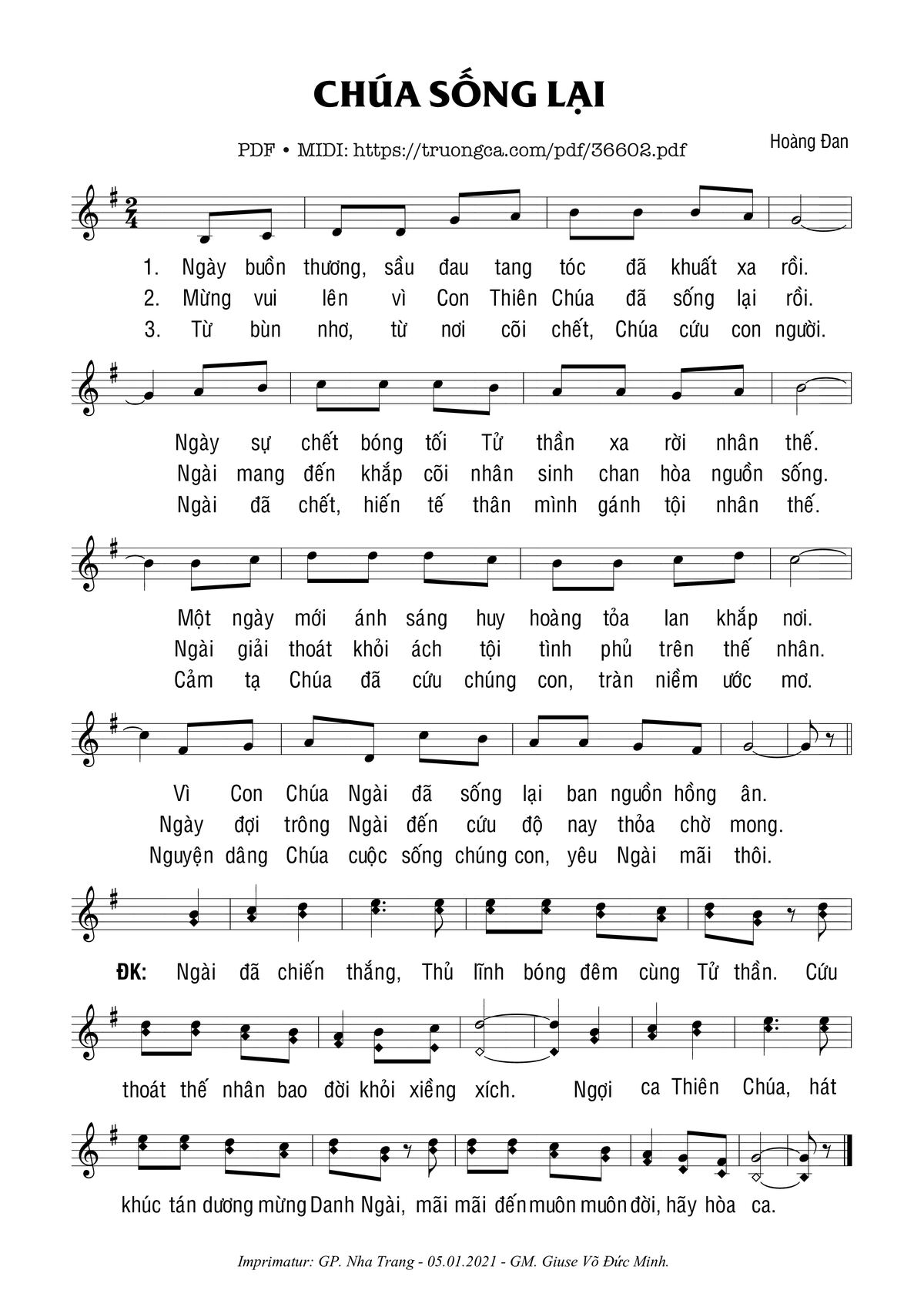 Điệp khúc: Giáo nhân chung tiếng ca vui mầng. Chúa sống lại khởi hoàn. Trời đất hãy vui ca Al-le-lu-ia. Nào ta rập tiếng hân hoan vì Chúa ta khởi hoàn.