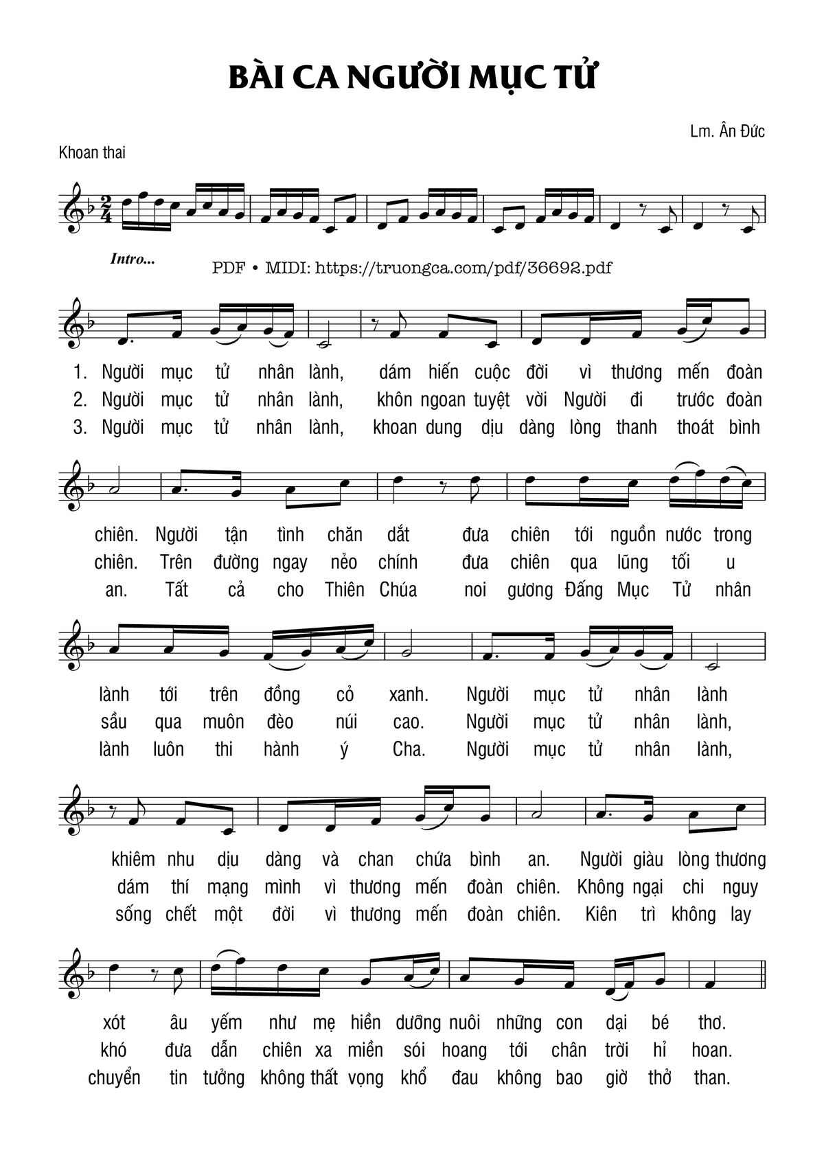 2- Người mục tử nhân lành, khôn ngoan tuyệt vời Người đi trước đoàn chiên. Trên đường ngay nẻo chính đưa chiên qua lũng tối u sầu qua muôn đèo núi cao. Người mục tử nhân lành, dám thí mạng mình vì thương mến đoàn chiên. Không ngại chi nguy khó đưa dẫn chiên xa miền sói hoang tới chân trời hỉ hoan.