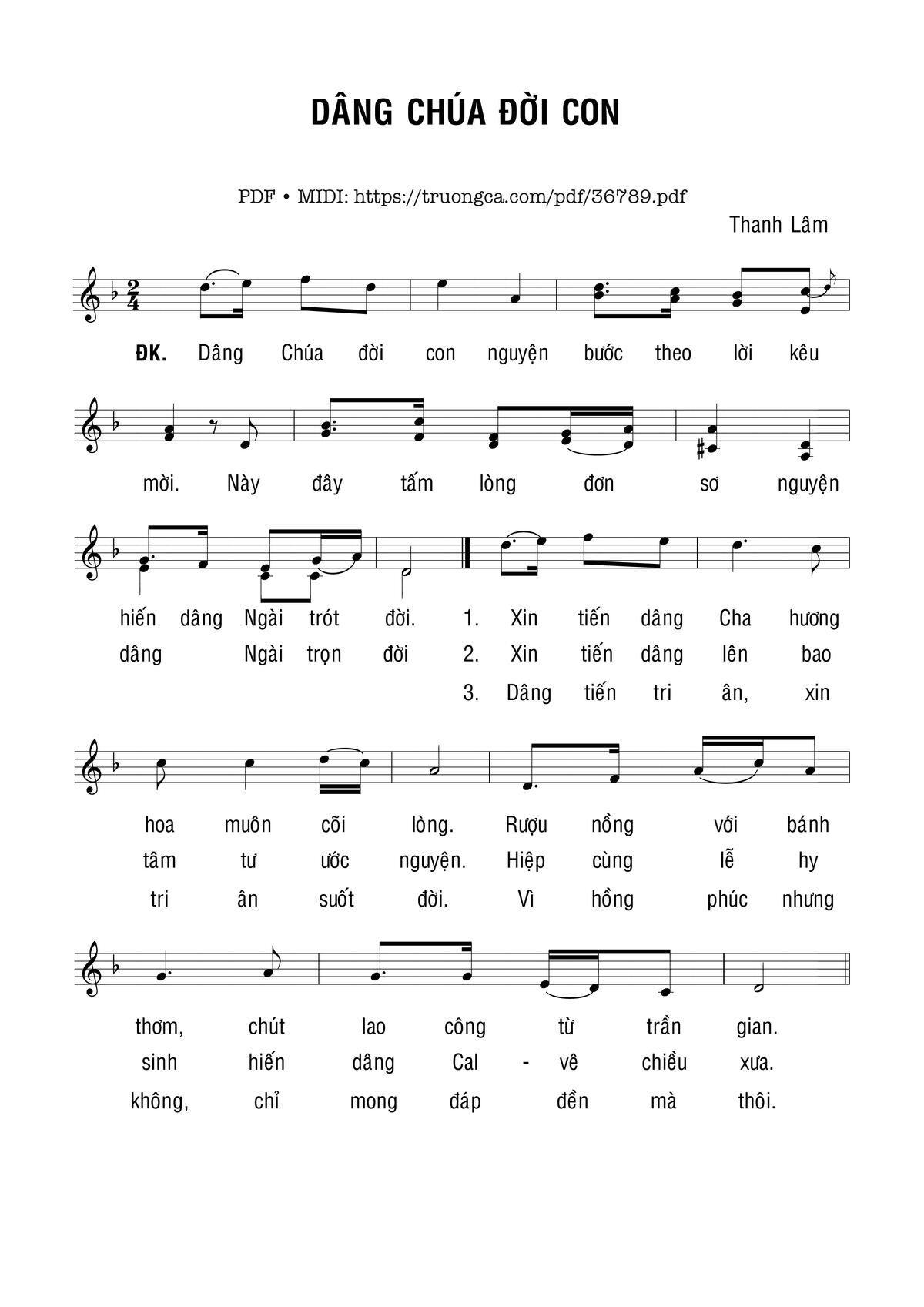 Điệp khúc. Dâng Chúa đời con nguyện bước theo lời kêu mời. Này đây tấm lòng đơn sơ nguyện hiến dâng Ngài trót đời.