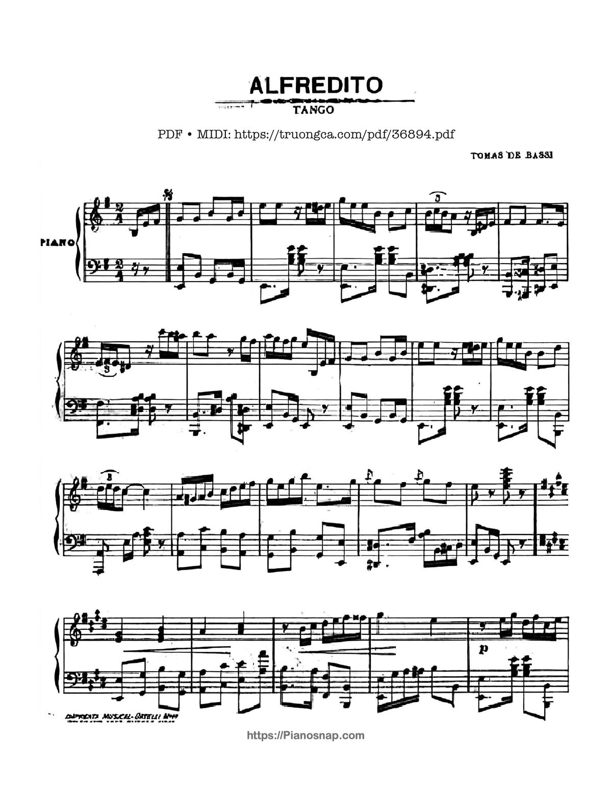 Sheet nhạc có nốt Alfredo Tango của nhạc sĩ Tomás De Bassi và file PDF nốt nhạc đăng lên đây nhằm giúp các bạn xướng âm cho đúng nốt và hát thêm hay, chỉ mang tính chất tham khảo, không có mục đích thương mại. Bản quyền thuộc về tác giả và tổ chức nắm bản quyền, Truongca.com không giữ bất kỳ bản quyền của nội dung nào cả. Các bạn có thể tải về bản PDF chất lượng cao, gồm khuông nhạc có nốt với đường link file PDF bên trên.