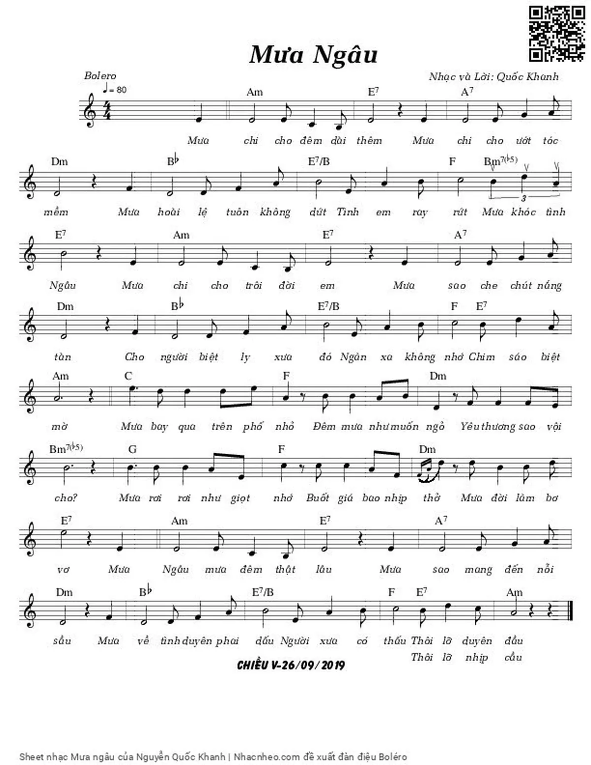 Nguyễn Quốc Khanh Mưa chi cho đêm dài thêm Mưa chi cho ướt tóc mềm [PDF] [Sheet] [Lời H.A] [Mp4/Midi]