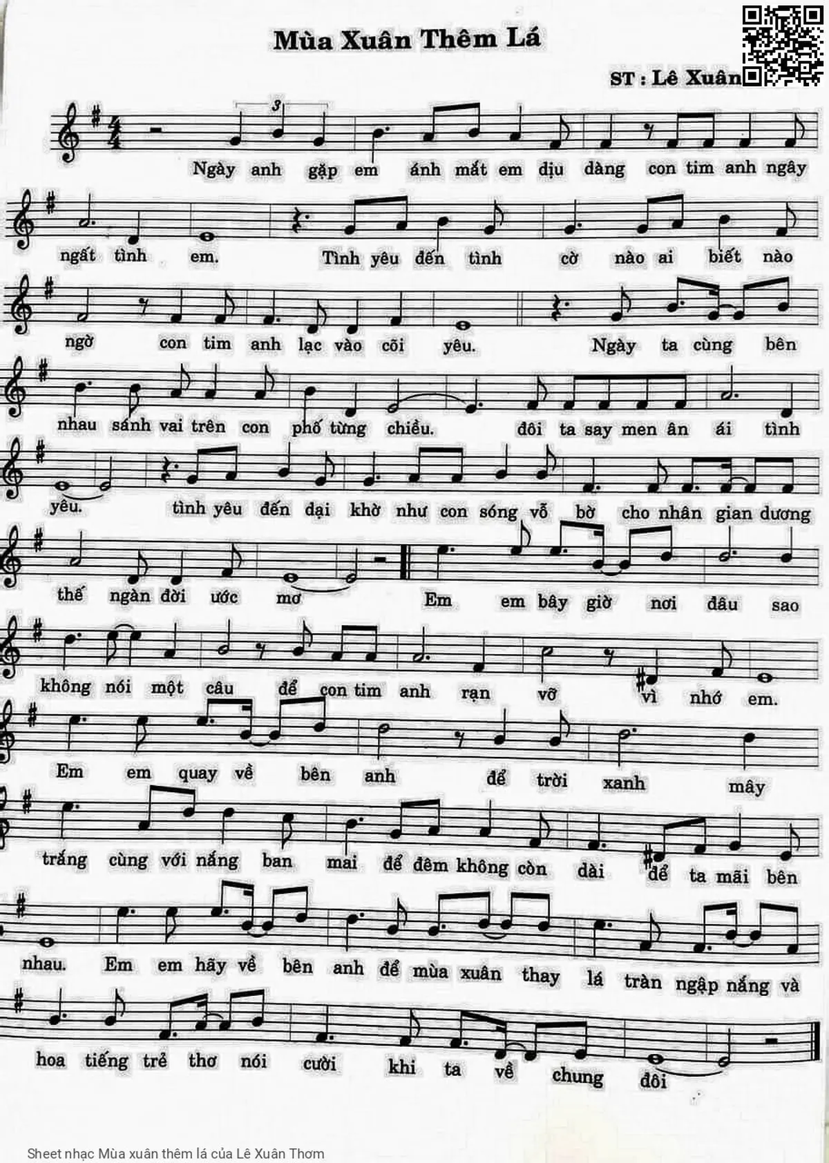 Phần nghe hát Mùa xuân thêm lá (Lê Xuân Thơm) được nhúng từ Youtube, Musescore hoặc link ngoài và chịu sự kiểm soát bản quyền của bên thứ ba đó, vì vậy có thể bị xóa hoặc chèn quảng cáo bất kỳ lúc nào. Nếu bạn không nghe - xem được ca sĩ hát tức là đã bị Youtube hoặc Musescore kiểm soát.
