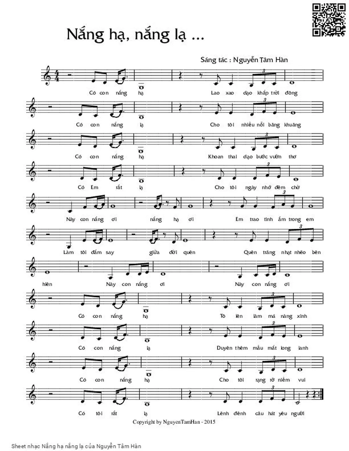 Nguyễn Tâm Hàn Có con nắng hạ Lao xao dạo khắp trời đông [PDF] [Sheet] [Lời H.A] [Mp4/Midi]
