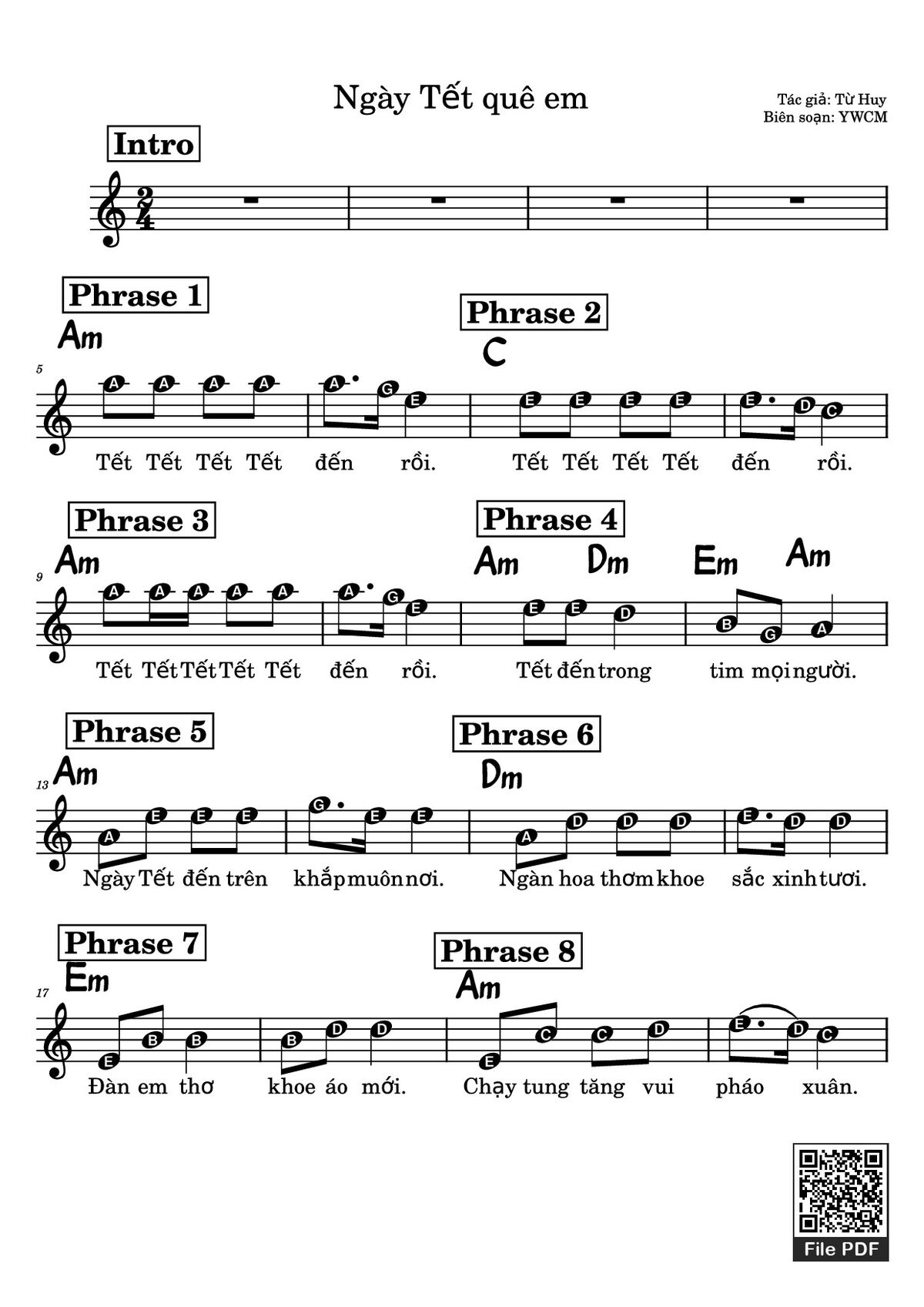 Phần nghe hát Ngày Tết quê em (Từ Huy) được nhúng từ Youtube, Musescore hoặc link ngoài và chịu sự kiểm soát bản quyền của bên thứ ba đó, vì vậy có thể bị xóa hoặc chèn quảng cáo bất kỳ lúc nào. Nếu bạn không nghe - xem được ca sĩ hát tức là đã bị Youtube hoặc Musescore kiểm soát.