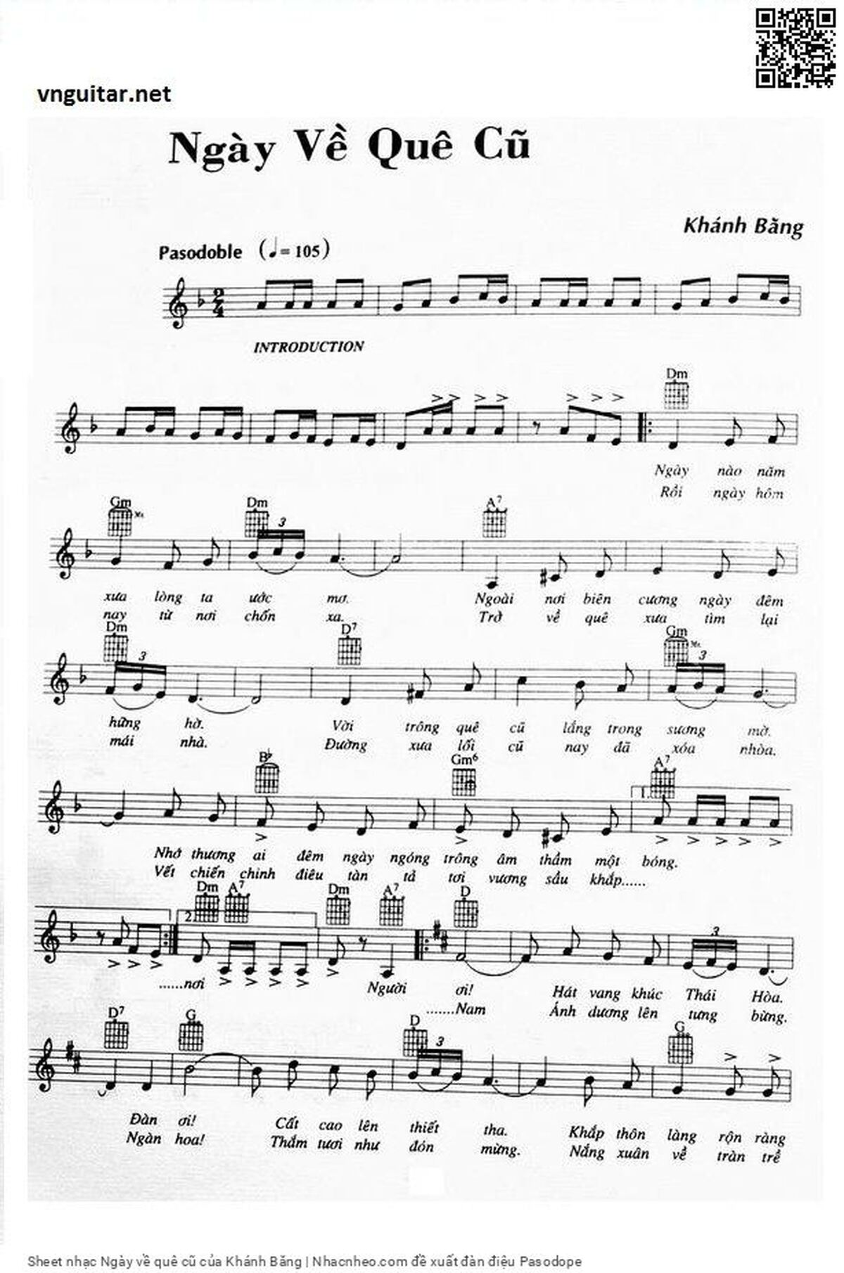 Chọn nút dấu + để tăng tông lên nửa cung, nút dấu - để giảm tông xuống nửa cung. Rê chuột vào hợp âm để xem các thế bấm hợp âm của bài hát Ngày về quê cũ.