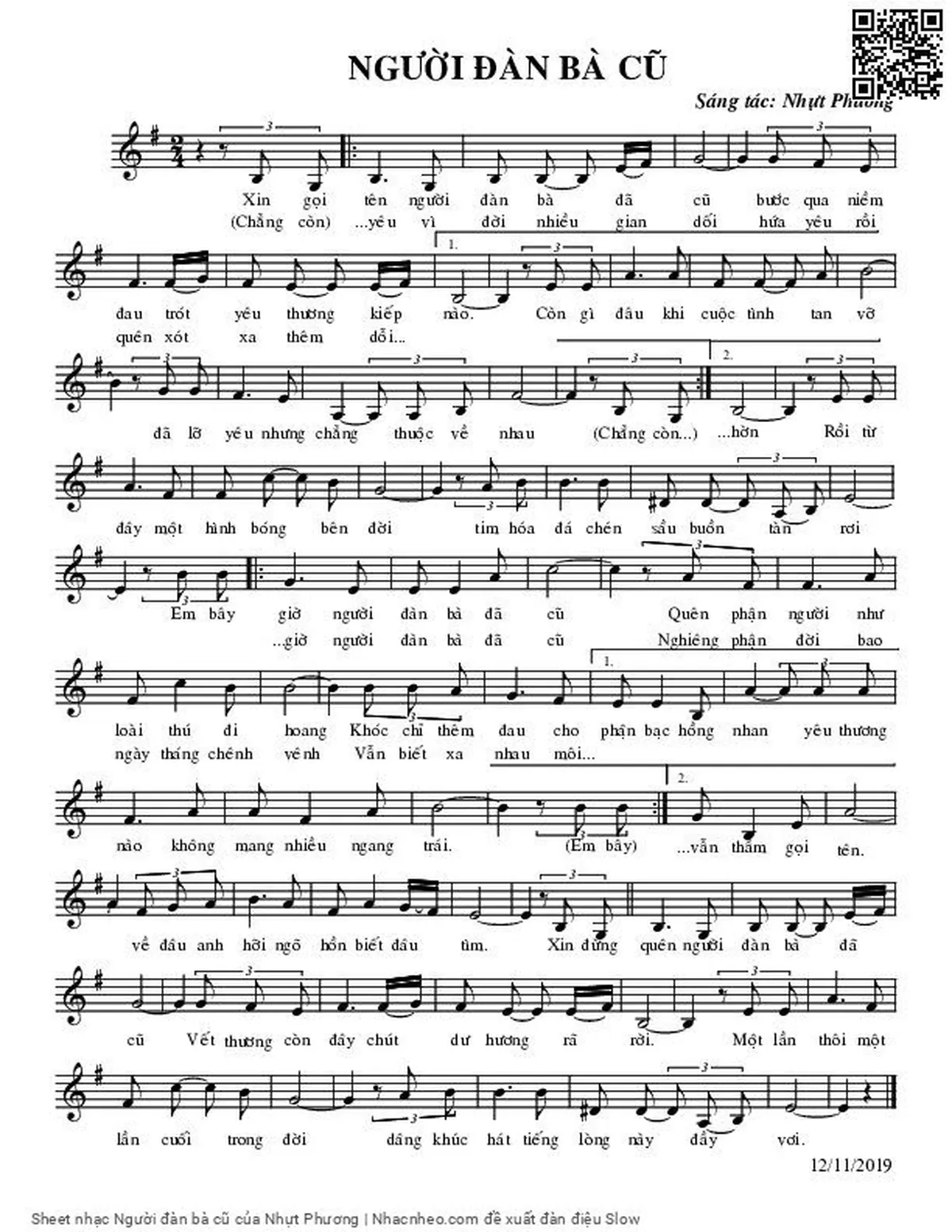 Phần nghe hát Người đàn bà cũ (Nhựt Phương) được nhúng từ Youtube, Musescore hoặc link ngoài và chịu sự kiểm soát bản quyền của bên thứ ba đó, vì vậy có thể bị xóa hoặc chèn quảng cáo bất kỳ lúc nào. Nếu bạn không nghe - xem được ca sĩ hát tức là đã bị Youtube hoặc Musescore kiểm soát.