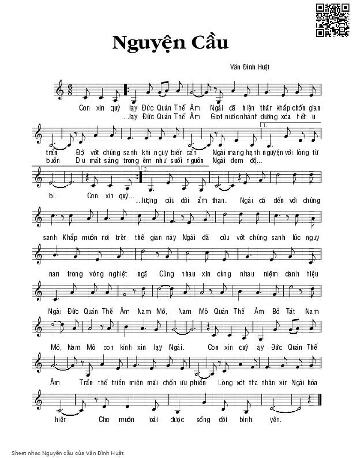 Phần nghe hát Nguyện cầu (Văn Đình Huật) được nhúng từ Youtube, Musescore hoặc link ngoài và chịu sự kiểm soát bản quyền của bên thứ ba đó, vì vậy có thể bị xóa hoặc chèn quảng cáo bất kỳ lúc nào. Nếu bạn không nghe - xem được ca sĩ hát tức là đã bị Youtube hoặc Musescore kiểm soát.