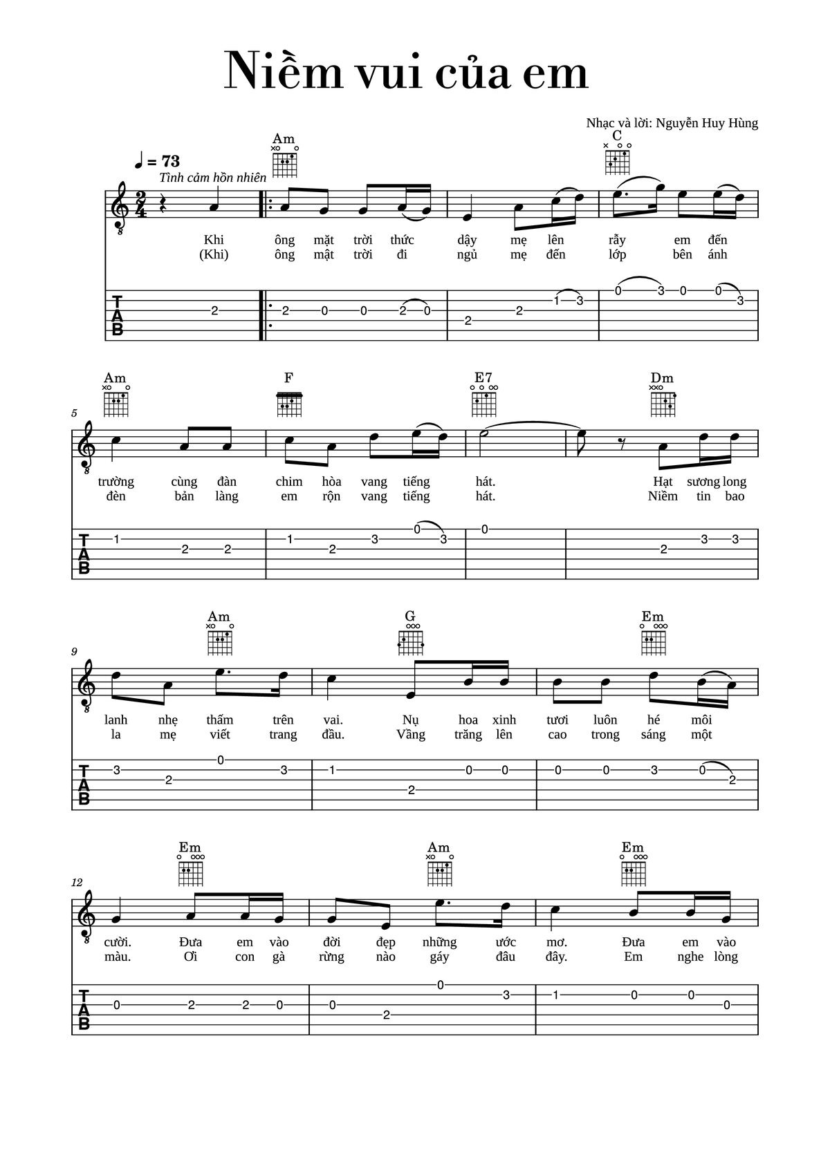 Chọn nút dấu + để tăng tông lên nửa cung, nút dấu - để giảm tông xuống nửa cung. Rê chuột vào hợp âm để xem các thế bấm hợp âm của bài hát Niềm vui của em.