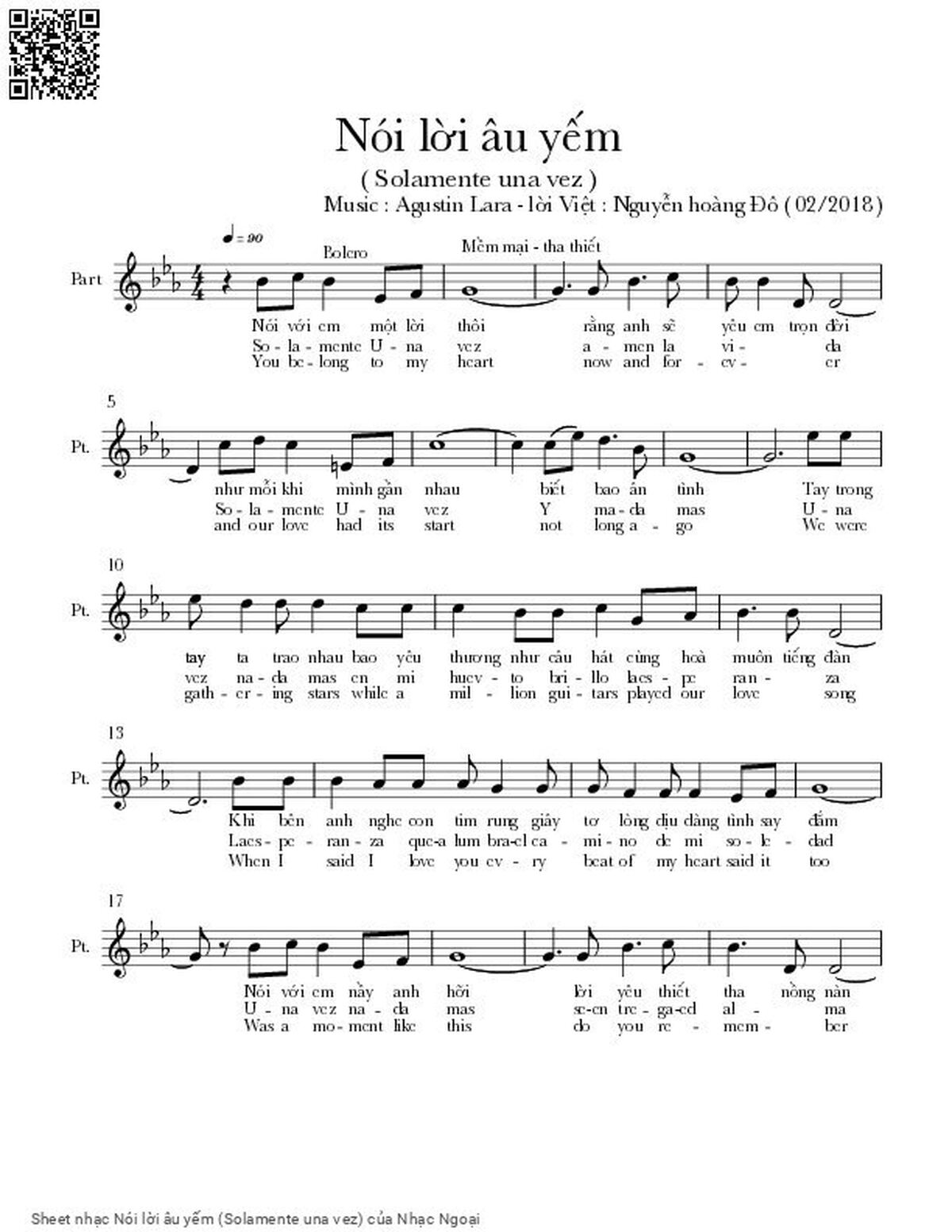 Phần nghe hát Nói lời âu yếm (Solamente una vez) (Nhạc Ngoại) được nhúng từ Youtube, Musescore hoặc link ngoài và chịu sự kiểm soát bản quyền của bên thứ ba đó, vì vậy có thể bị xóa hoặc chèn quảng cáo bất kỳ lúc nào. Nếu bạn không nghe - xem được ca sĩ hát tức là đã bị Youtube hoặc Musescore kiểm soát.