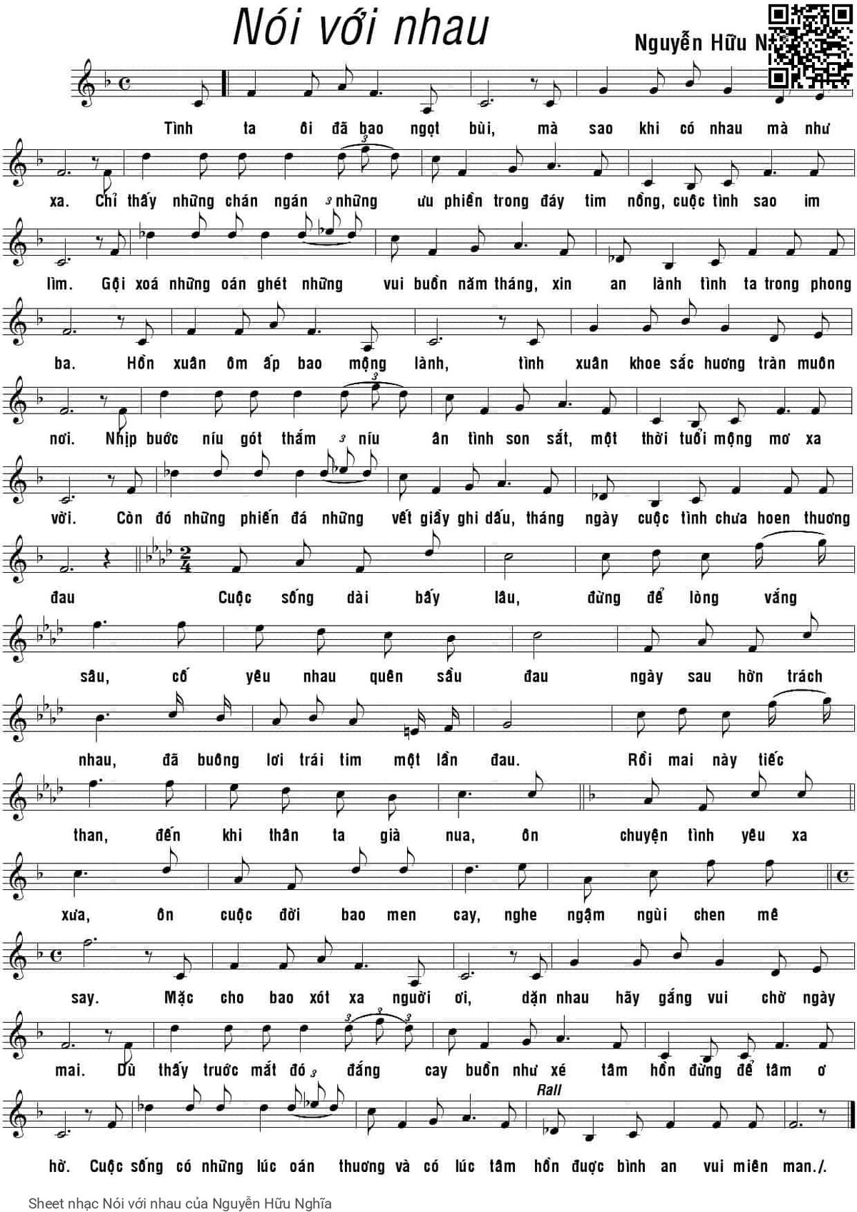 Phần nghe hát Nói với nhau (Nguyễn Hữu Nghĩa) được nhúng từ Youtube, Musescore hoặc link ngoài và chịu sự kiểm soát bản quyền của bên thứ ba đó, vì vậy có thể bị xóa hoặc chèn quảng cáo bất kỳ lúc nào. Nếu bạn không nghe - xem được ca sĩ hát tức là đã bị Youtube hoặc Musescore kiểm soát.