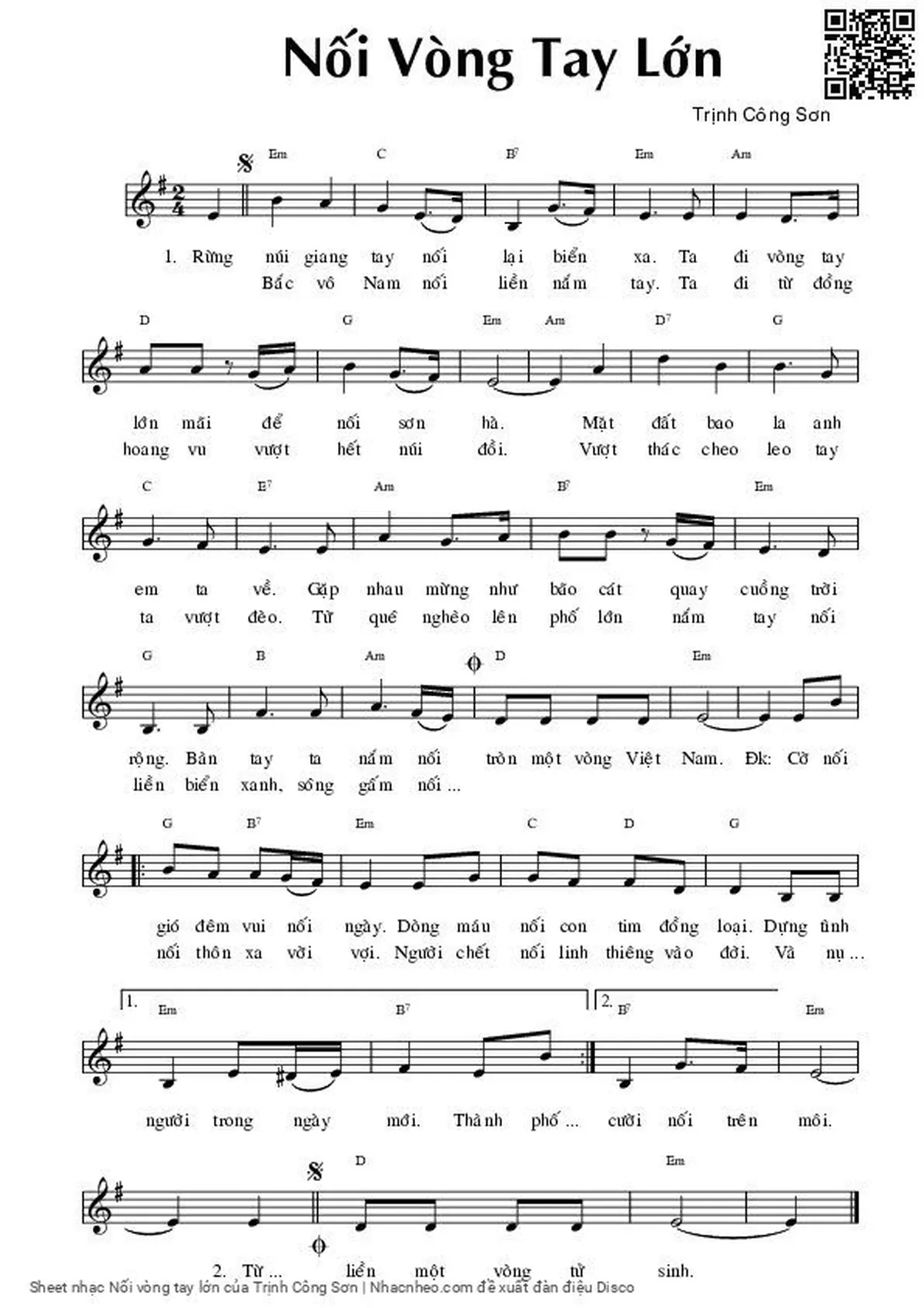 Chọn nút dấu + để tăng tông lên nửa cung, nút dấu - để giảm tông xuống nửa cung. Rê chuột vào hợp âm để xem các thế bấm hợp âm của bài hát Nối vòng tay lớn.