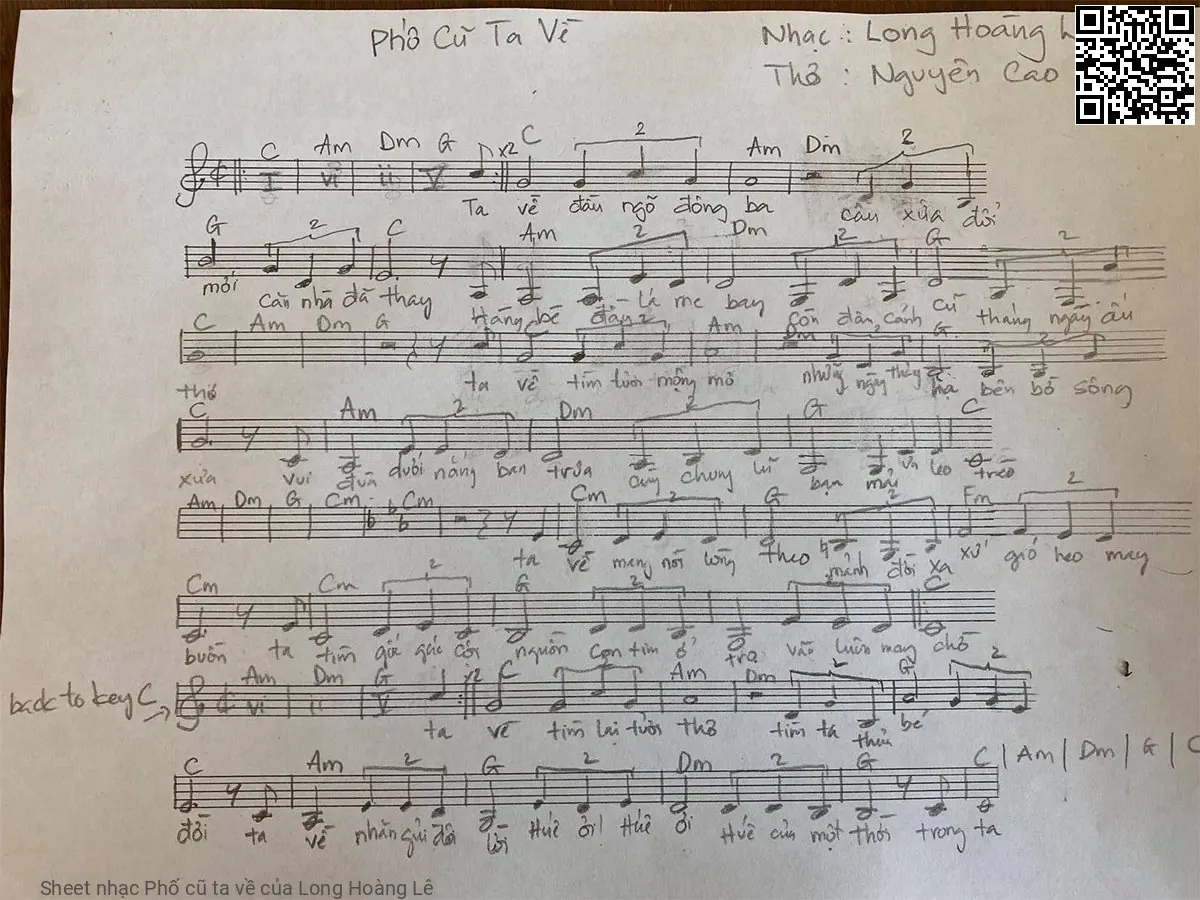 Chọn nút dấu + để tăng tông lên nửa cung, nút dấu - để giảm tông xuống nửa cung. Rê chuột vào hợp âm để xem các thế bấm hợp âm của bài hát Phố cũ ta về.