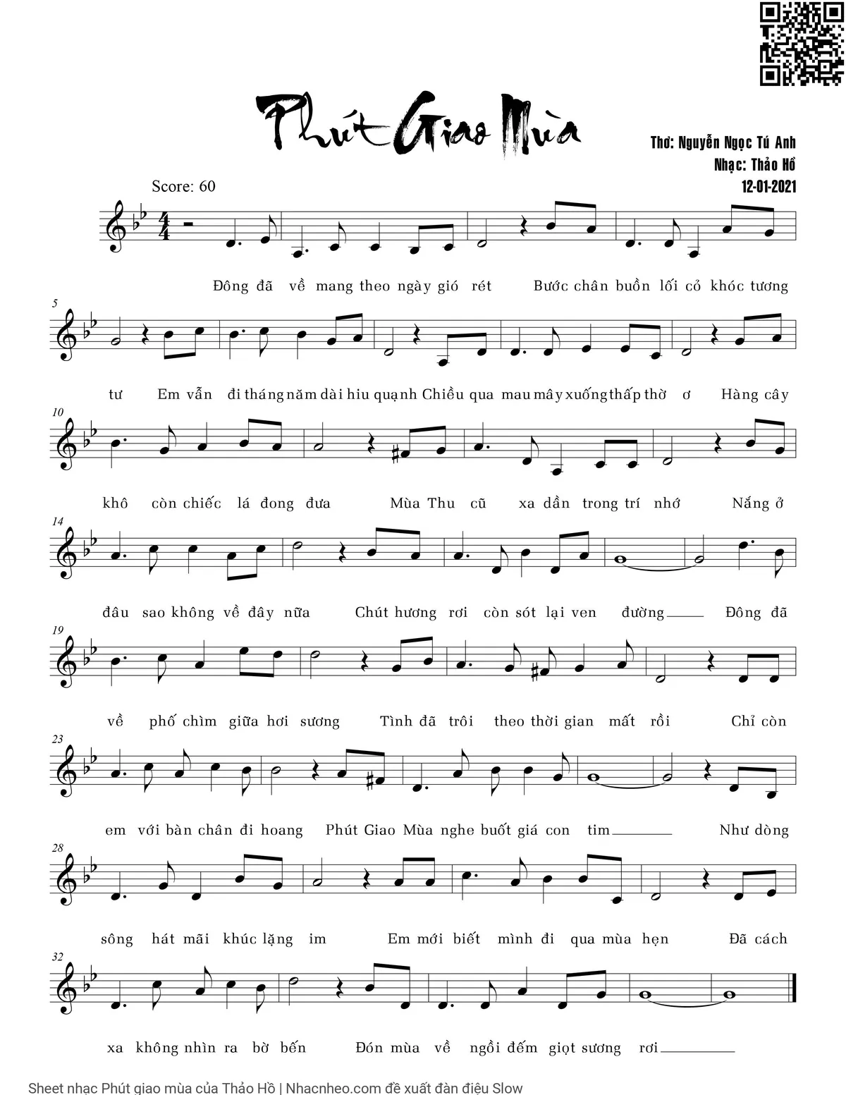 Phần nghe hát Phút giao mùa (Thảo Hồ) được nhúng từ Youtube, Musescore hoặc link ngoài và chịu sự kiểm soát bản quyền của bên thứ ba đó, vì vậy có thể bị xóa hoặc chèn quảng cáo bất kỳ lúc nào. Nếu bạn không nghe - xem được ca sĩ hát tức là đã bị Youtube hoặc Musescore kiểm soát.