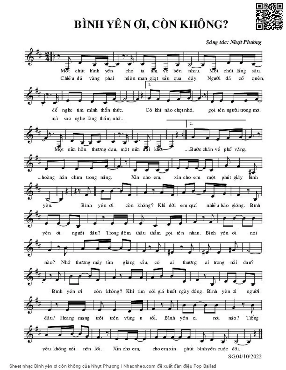 Nhựt Phương Bình yên ơi còn không Khi đời em quá nhiều bão dông [PDF] [Sheet] [Lời H.A] [Mp4/Midi]