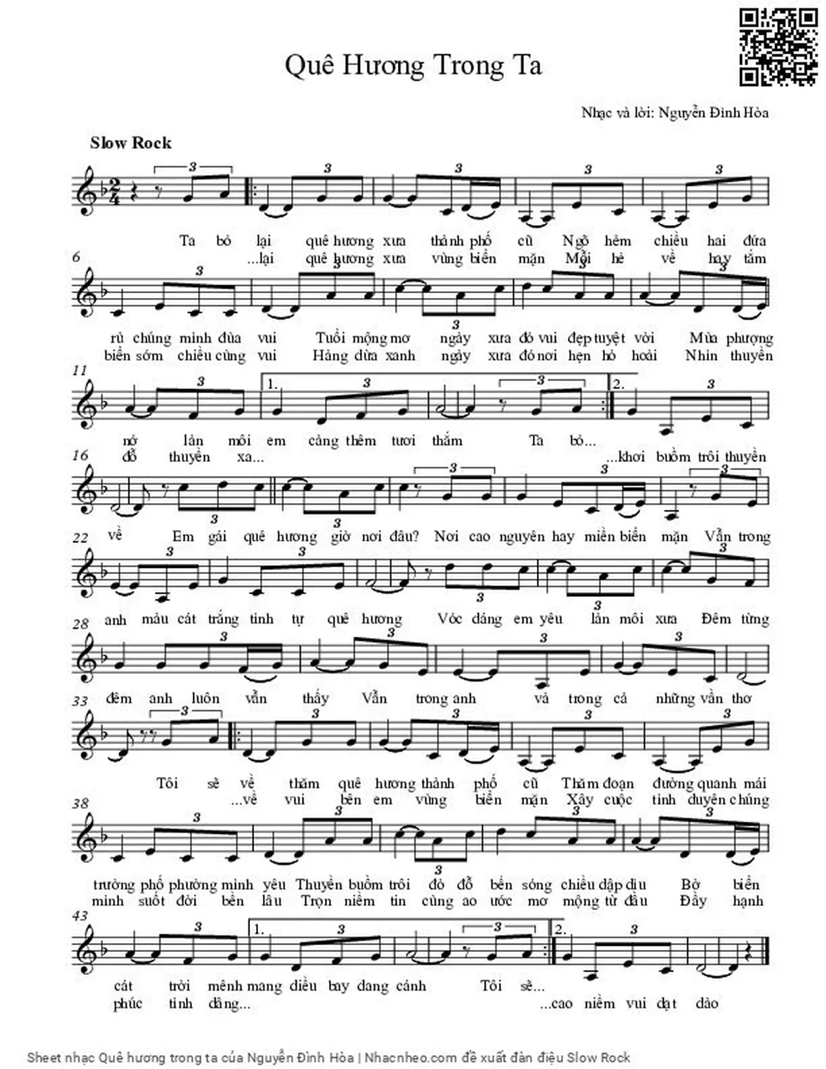 Phần nghe hát Quê hương trong ta (Nguyễn Đình Hòa) được nhúng từ Youtube, Musescore hoặc link ngoài và chịu sự kiểm soát bản quyền của bên thứ ba đó, vì vậy có thể bị xóa hoặc chèn quảng cáo bất kỳ lúc nào. Nếu bạn không nghe - xem được ca sĩ hát tức là đã bị Youtube hoặc Musescore kiểm soát.