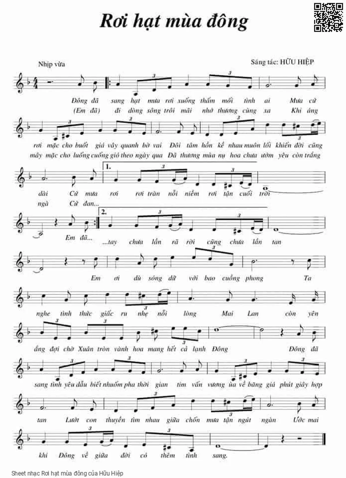 Hữu Hiệp Đông đã sang hạt mưa rơi xuống thấm mối tình ai [PDF] [Sheet] [Lời H.A] [Mp4/Midi]