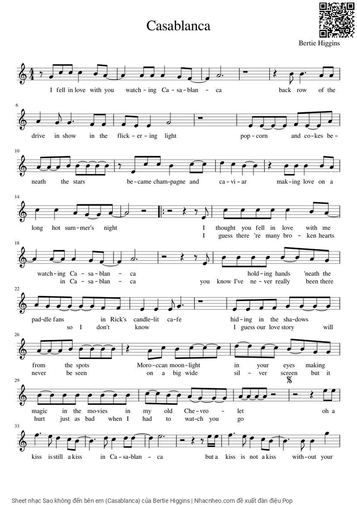 Bertie Higgins I fell in love with you watching Casa blanca Back row at the drive in show in the flickering light [PDF] [Sheet] [Lời H.A] [Mp4/Midi]