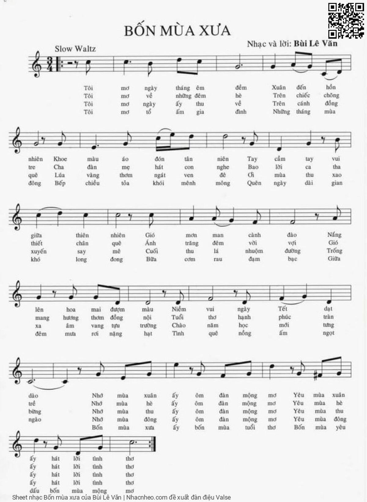 Phần nghe hát Bốn mùa xưa (Bùi Lê Văn) được nhúng từ Youtube, Musescore hoặc link ngoài và chịu sự kiểm soát bản quyền của bên thứ ba đó, vì vậy có thể bị xóa hoặc chèn quảng cáo bất kỳ lúc nào. Nếu bạn không nghe - xem được ca sĩ hát tức là đã bị Youtube hoặc Musescore kiểm soát.