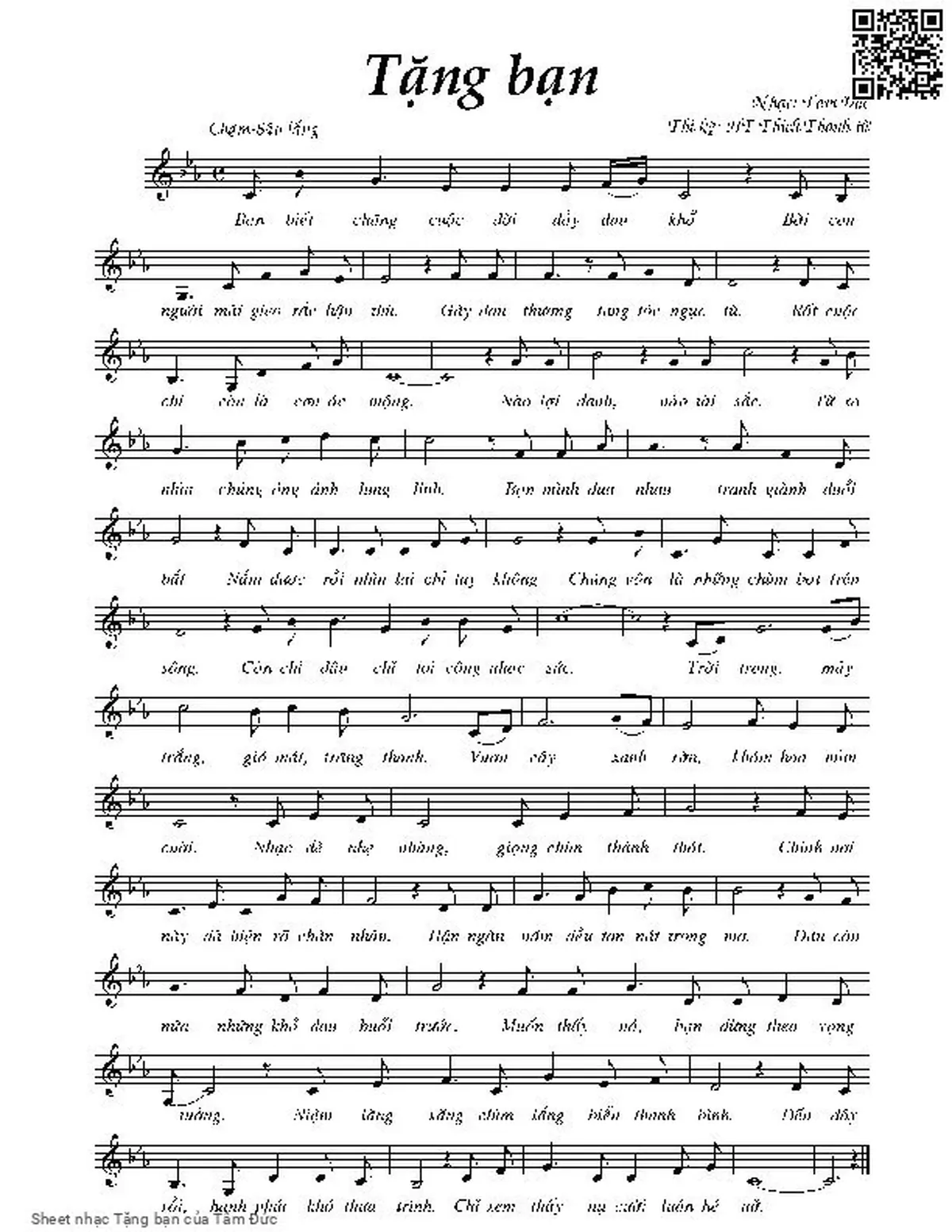 Phần nghe hát Tặng bạn (Tâm Đức) được nhúng từ Youtube, Musescore hoặc link ngoài và chịu sự kiểm soát bản quyền của bên thứ ba đó, vì vậy có thể bị xóa hoặc chèn quảng cáo bất kỳ lúc nào. Nếu bạn không nghe - xem được ca sĩ hát tức là đã bị Youtube hoặc Musescore kiểm soát.