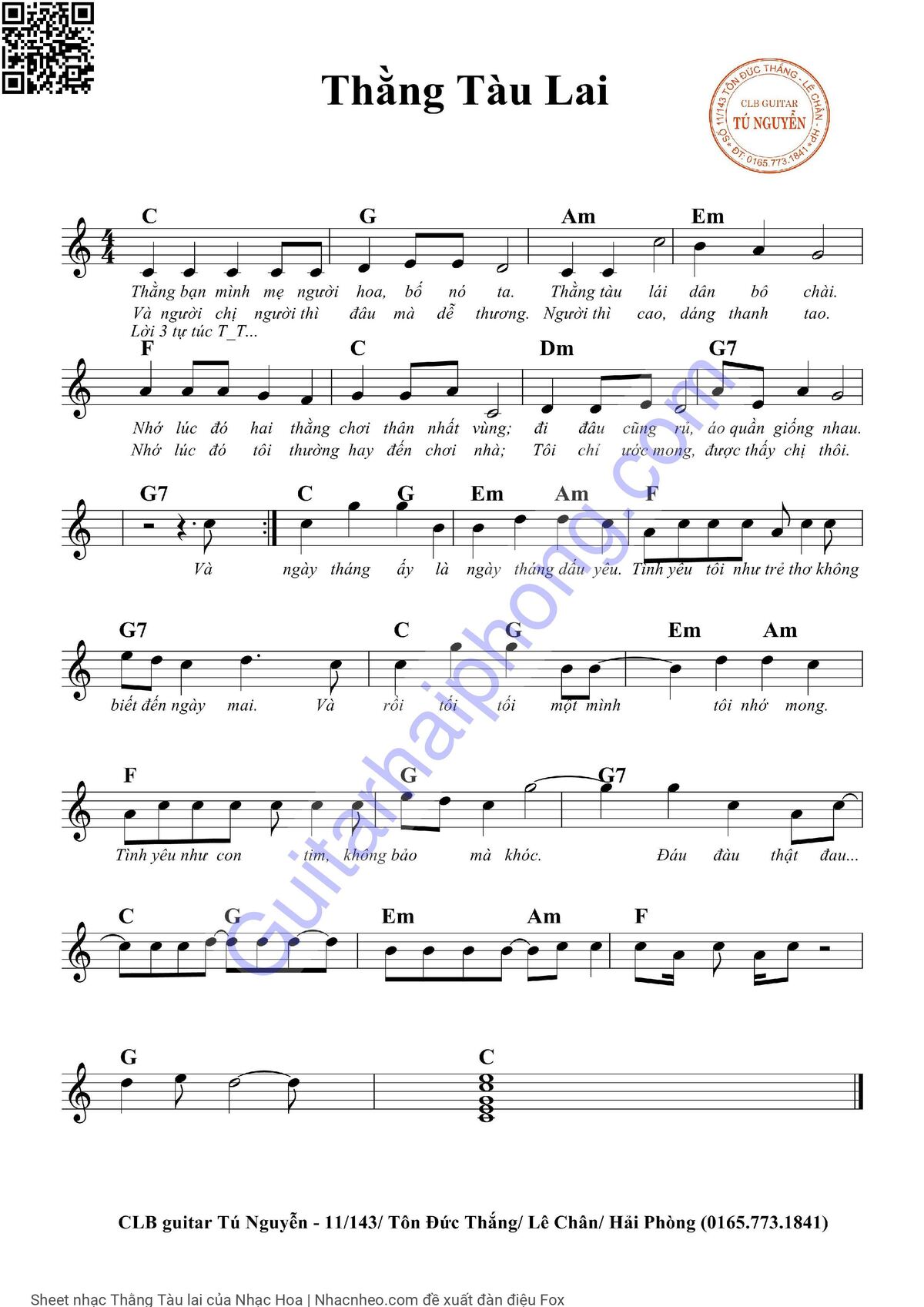 Chọn nút dấu + để tăng tông lên nửa cung, nút dấu - để giảm tông xuống nửa cung. Rê chuột vào hợp âm để xem các thế bấm hợp âm của bài hát Thằng Tàu lai.