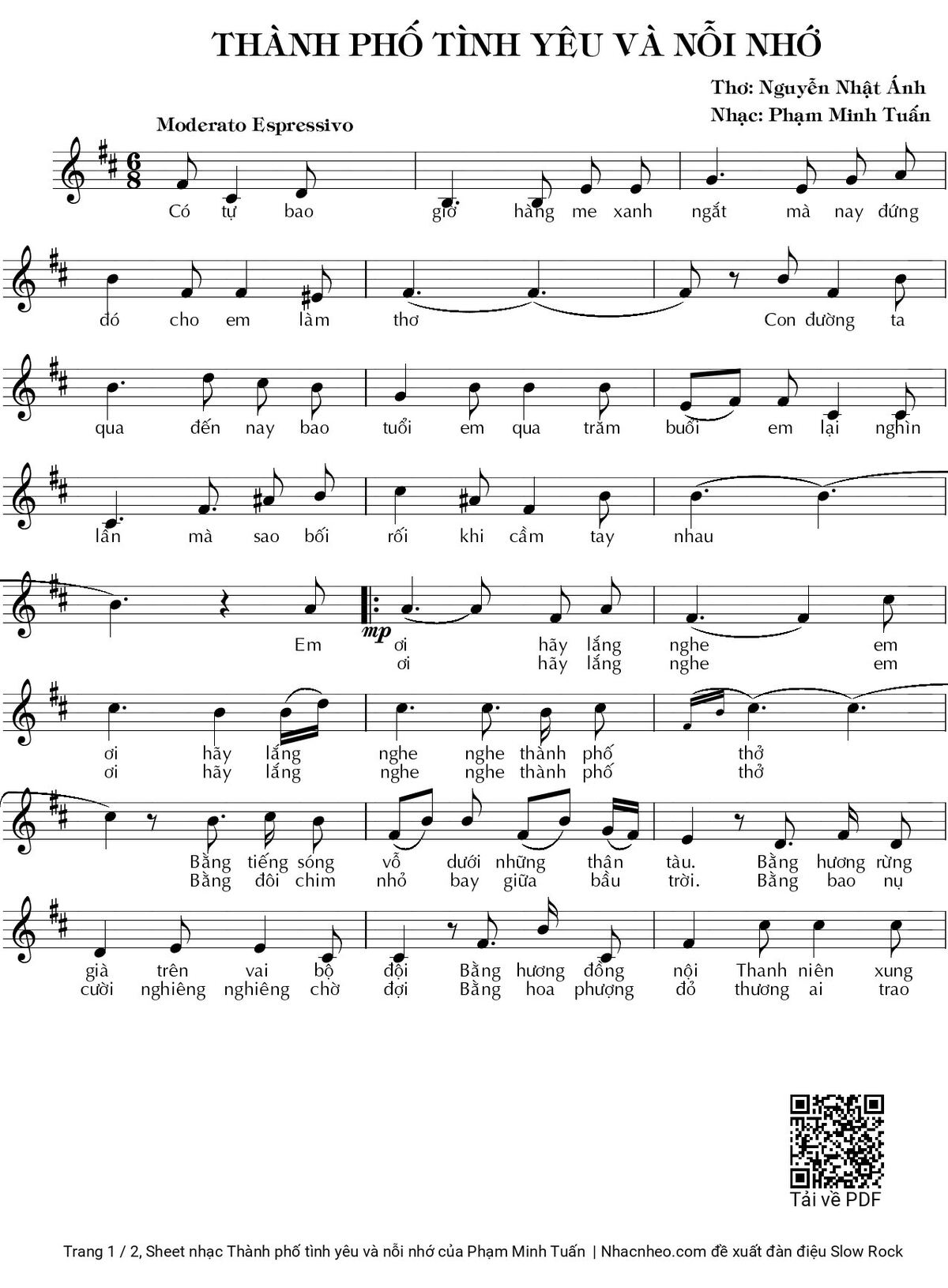 Phần nghe hát Thành phố tình yêu và nỗi nhớ (Phạm Minh Tuấn) được nhúng từ Youtube, Musescore hoặc link ngoài và chịu sự kiểm soát bản quyền của bên thứ ba đó, vì vậy có thể bị xóa hoặc chèn quảng cáo bất kỳ lúc nào. Nếu bạn không nghe - xem được ca sĩ hát tức là đã bị Youtube hoặc Musescore kiểm soát.