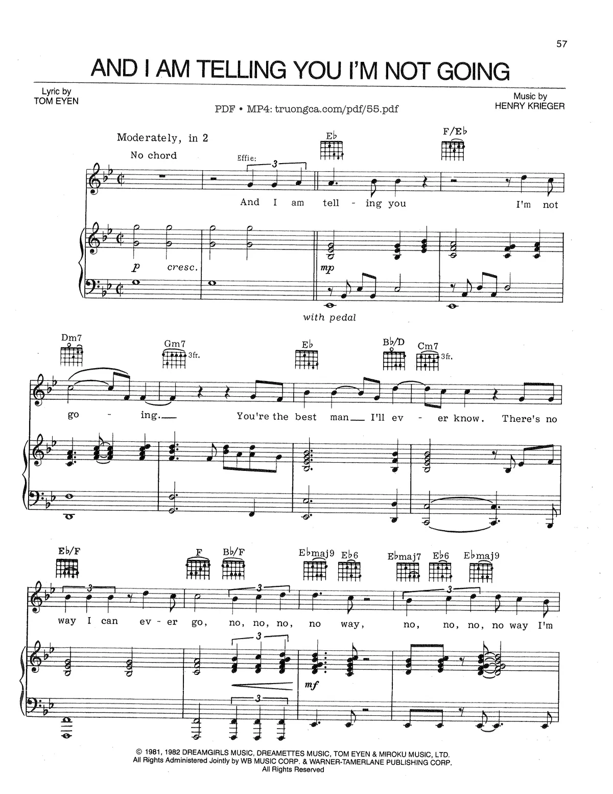 Phần nghe hát And I Am Telling You I'm Not Going đệm hát (Henry Krieger) được nhúng từ Youtube, Musescore hoặc link ngoài và chịu sự kiểm soát bản quyền của bên thứ ba đó, vì vậy có thể bị xóa hoặc chèn quảng cáo bất kỳ lúc nào. Nếu bạn không nghe - xem được ca sĩ hát tức là đã bị Youtube hoặc Musescore kiểm soát.