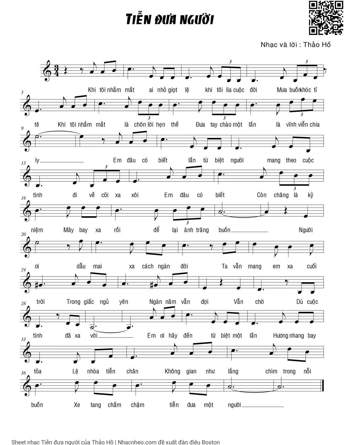Phần nghe hát Tiễn đưa người (Thảo Hồ) được nhúng từ Youtube, Musescore hoặc link ngoài và chịu sự kiểm soát bản quyền của bên thứ ba đó, vì vậy có thể bị xóa hoặc chèn quảng cáo bất kỳ lúc nào. Nếu bạn không nghe - xem được ca sĩ hát tức là đã bị Youtube hoặc Musescore kiểm soát.