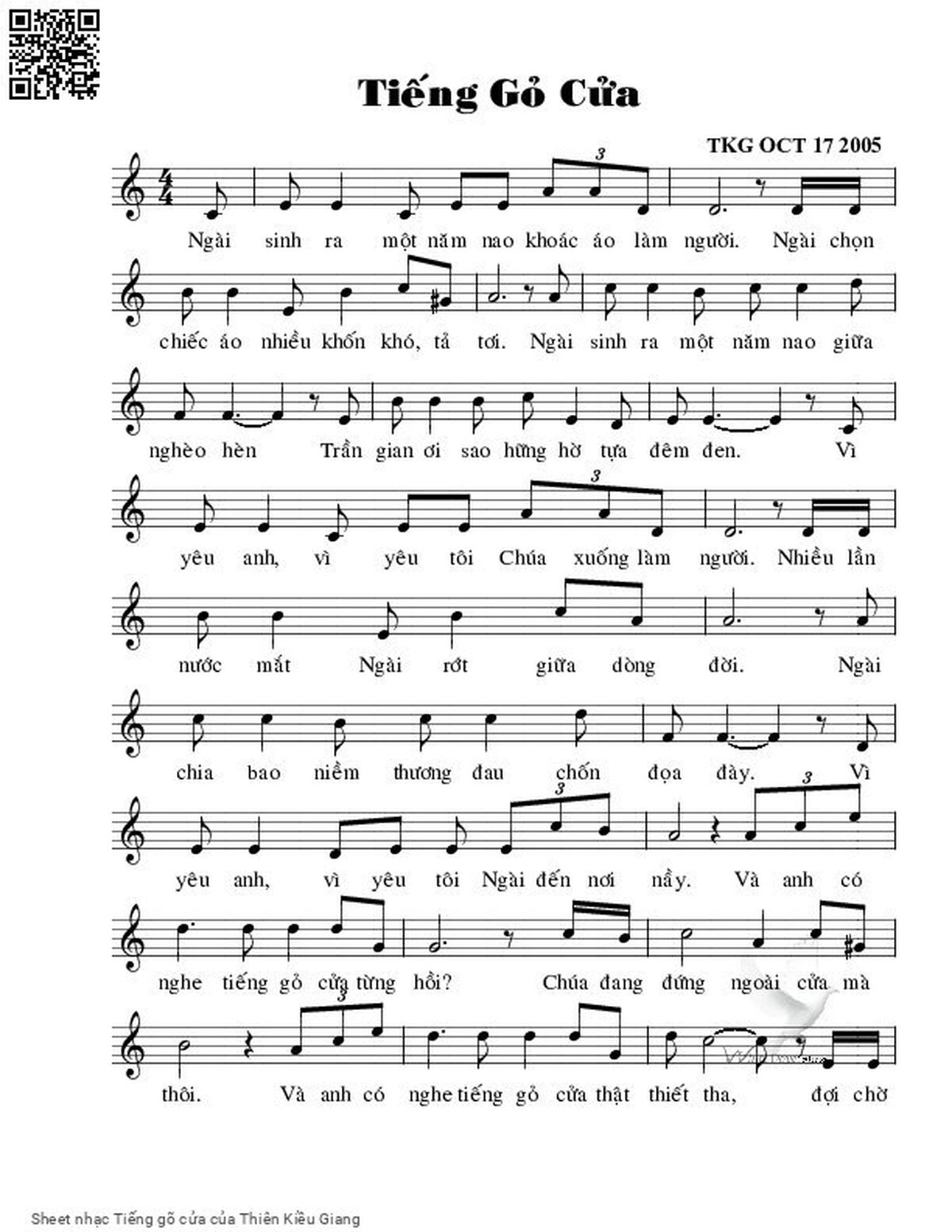 Phần nghe hát Tiếng gõ cửa (Thiên Kiều Giang) được nhúng từ Youtube, Musescore hoặc link ngoài và chịu sự kiểm soát bản quyền của bên thứ ba đó, vì vậy có thể bị xóa hoặc chèn quảng cáo bất kỳ lúc nào. Nếu bạn không nghe - xem được ca sĩ hát tức là đã bị Youtube hoặc Musescore kiểm soát.