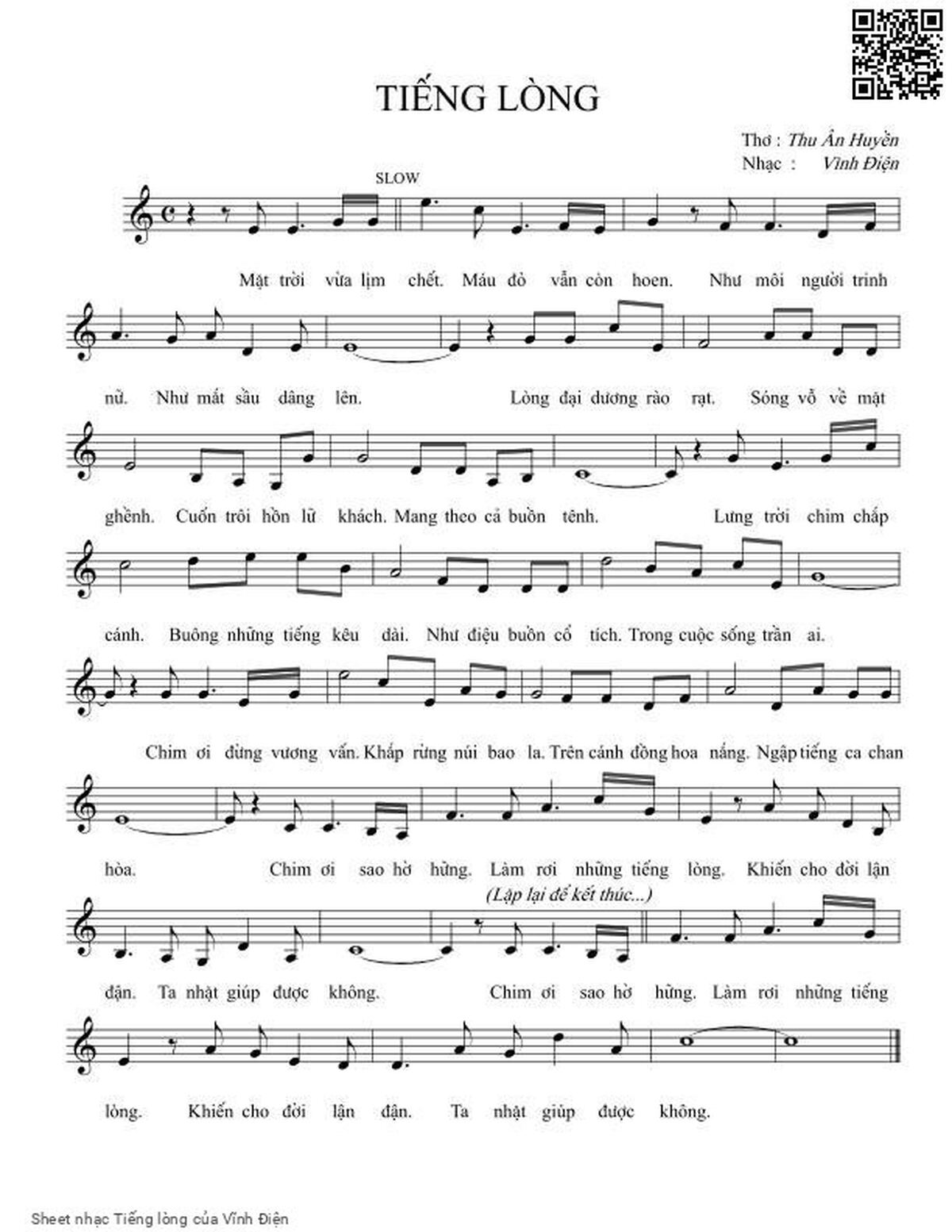 Phần nghe hát Tiếng lòng (Vĩnh Điện) được nhúng từ Youtube, Musescore hoặc link ngoài và chịu sự kiểm soát bản quyền của bên thứ ba đó, vì vậy có thể bị xóa hoặc chèn quảng cáo bất kỳ lúc nào. Nếu bạn không nghe - xem được ca sĩ hát tức là đã bị Youtube hoặc Musescore kiểm soát.