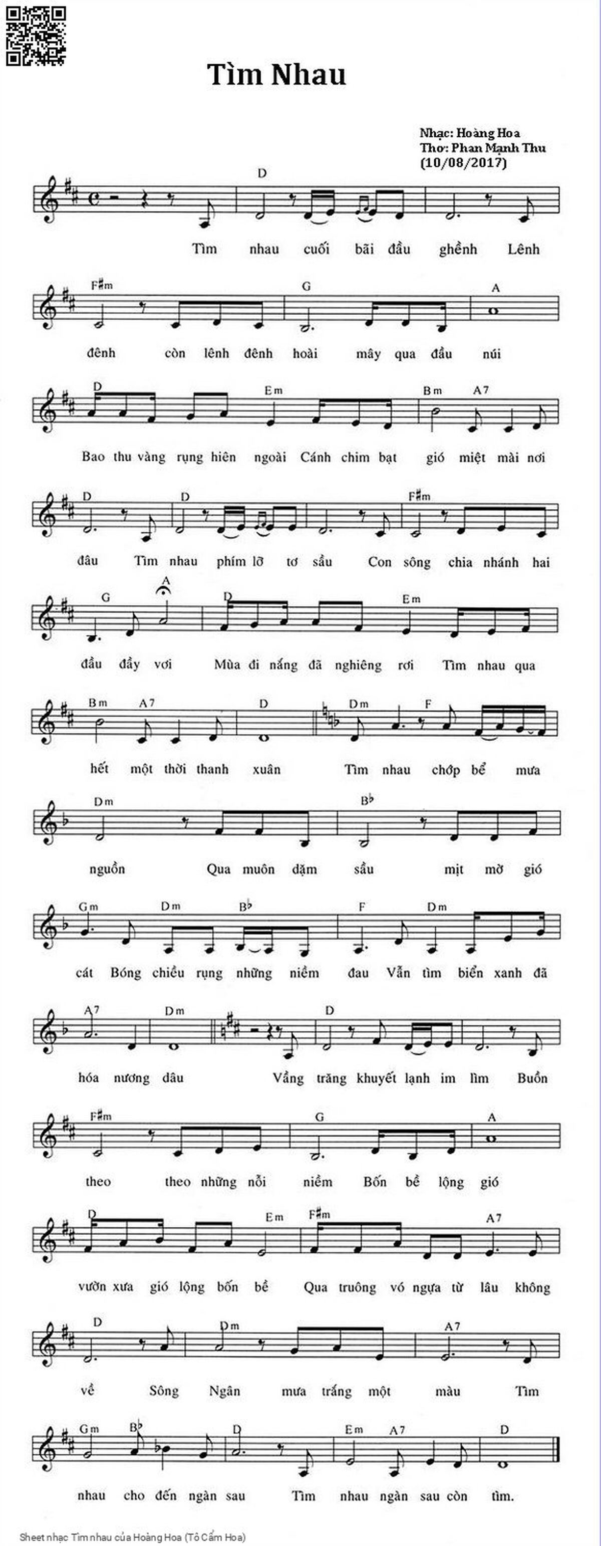 Phần nghe hát Tìm nhau (Hoàng Hoa (Tô Cẩm Hoa)) được nhúng từ Youtube, Musescore hoặc link ngoài và chịu sự kiểm soát bản quyền của bên thứ ba đó, vì vậy có thể bị xóa hoặc chèn quảng cáo bất kỳ lúc nào. Nếu bạn không nghe - xem được ca sĩ hát tức là đã bị Youtube hoặc Musescore kiểm soát.